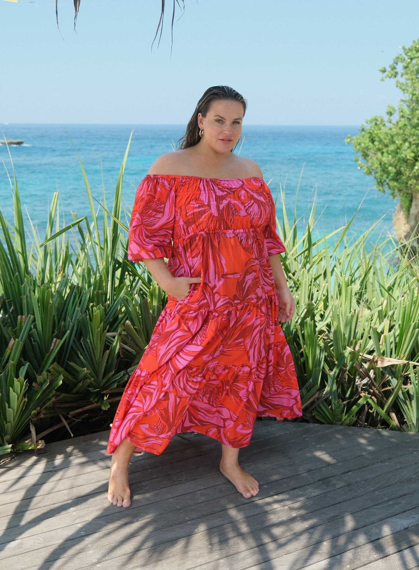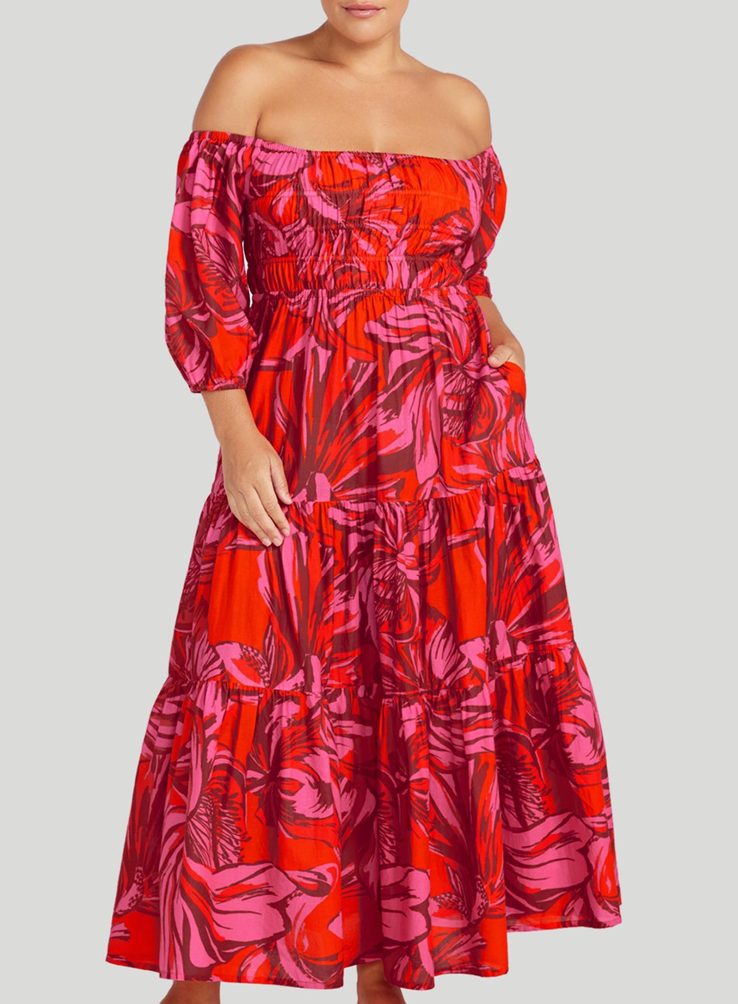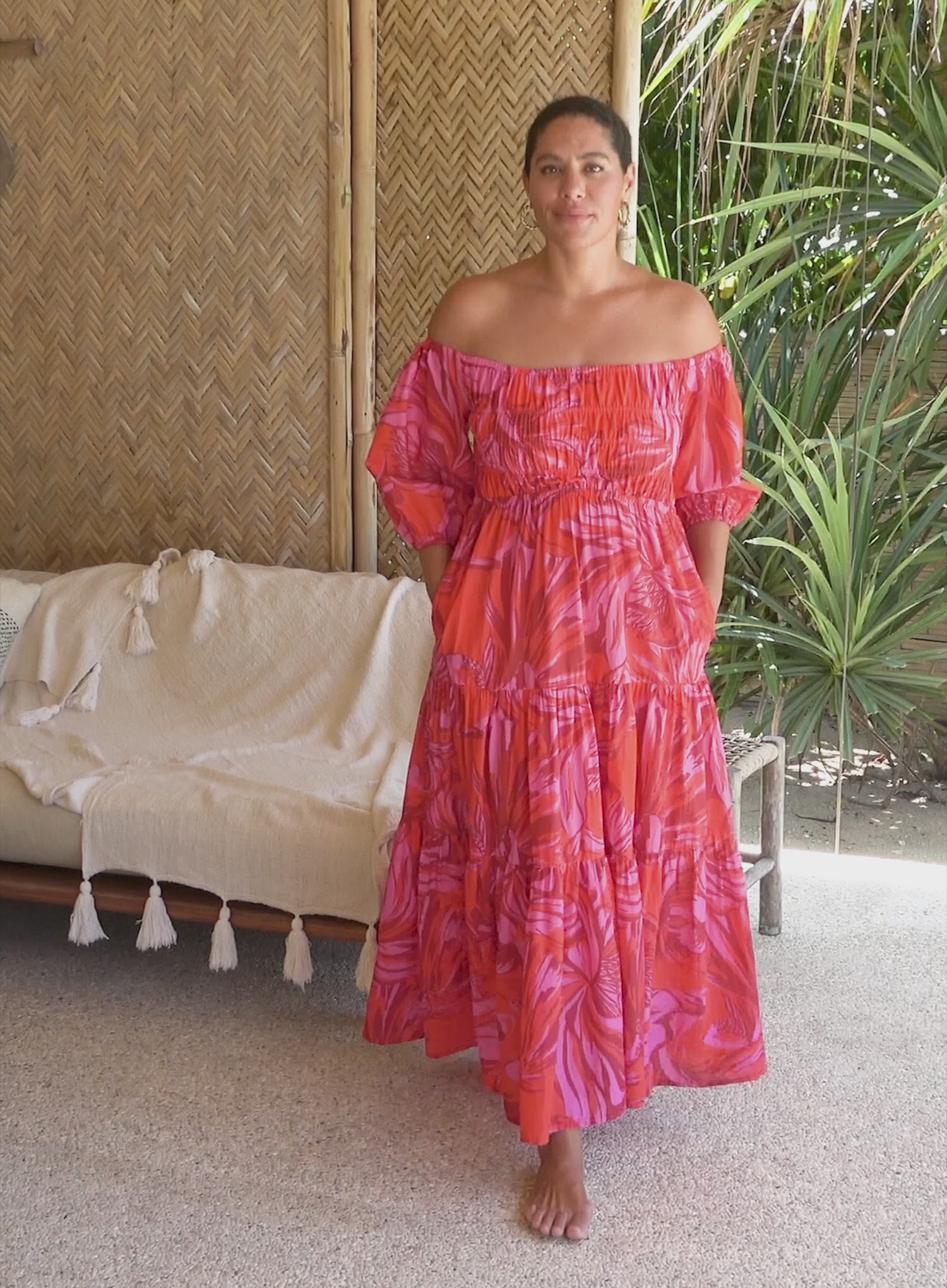 ARTESANDS Les Fauves Handel Long Maxi Dress Red is floral with an attitude! Using bold colors to capture light and space, this artwork spontaneously reflects nature with lively brushstrokes and vibrant hues. Handel offers an incredibly flattering design, including an elasticated waist, shirring and a tiered skirt for a feminine silhouette. This piece will effortlessly lay over your favourite swim pieces, or double as a resort chic look that can be dressed both up and down.