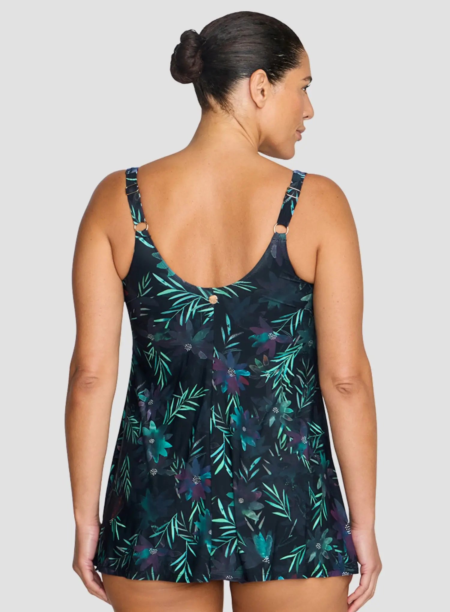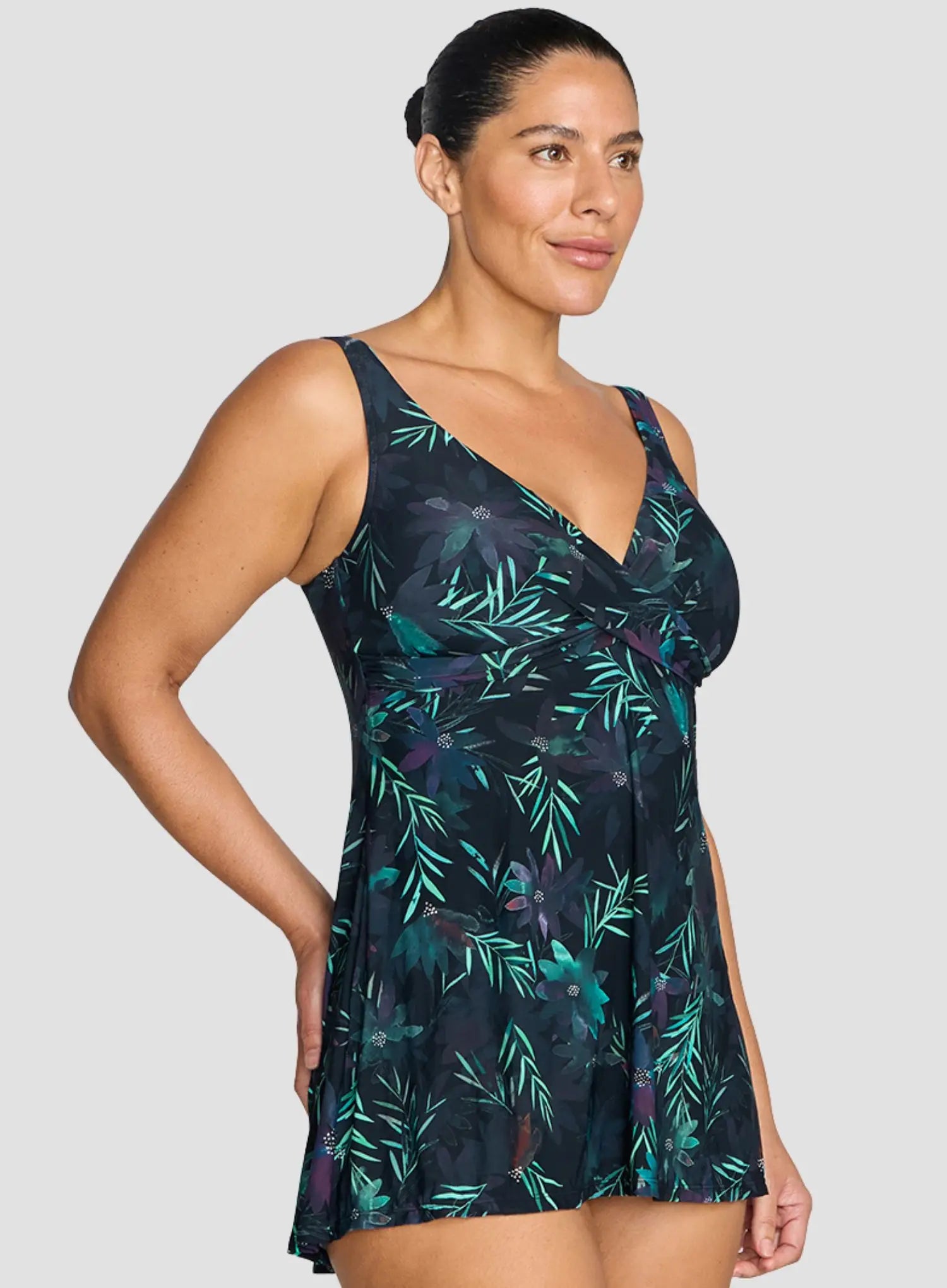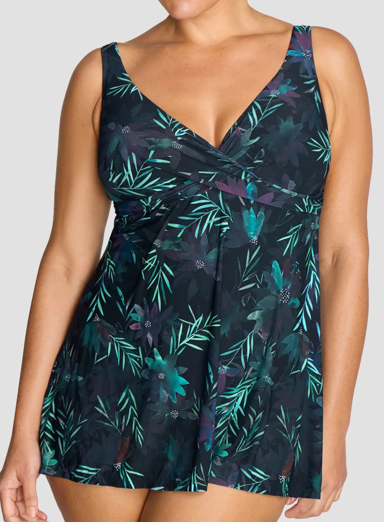 ARTESANDS Lunafleur Delacroix Swimdress in Navy is a sophisticated choice for curves and plus sizes. Its elegant floral print, featuring lush green leaves with coral, peach, and ivory accents on a deep navy background, creates a soft, refined look that’s effortlessly chic. The A-line silhouette skims the body without clinging, offering a flattering fit for all-day comfort.