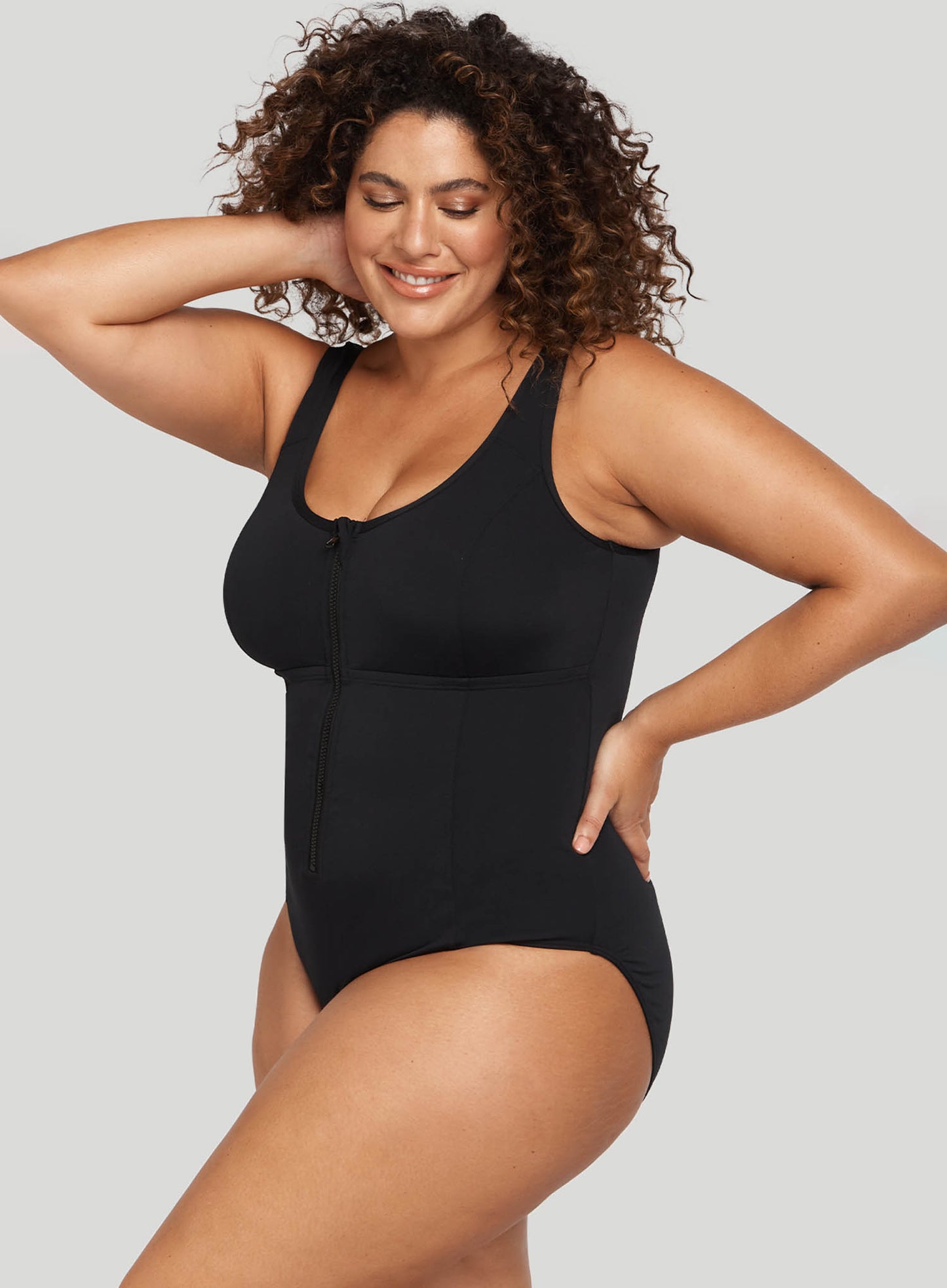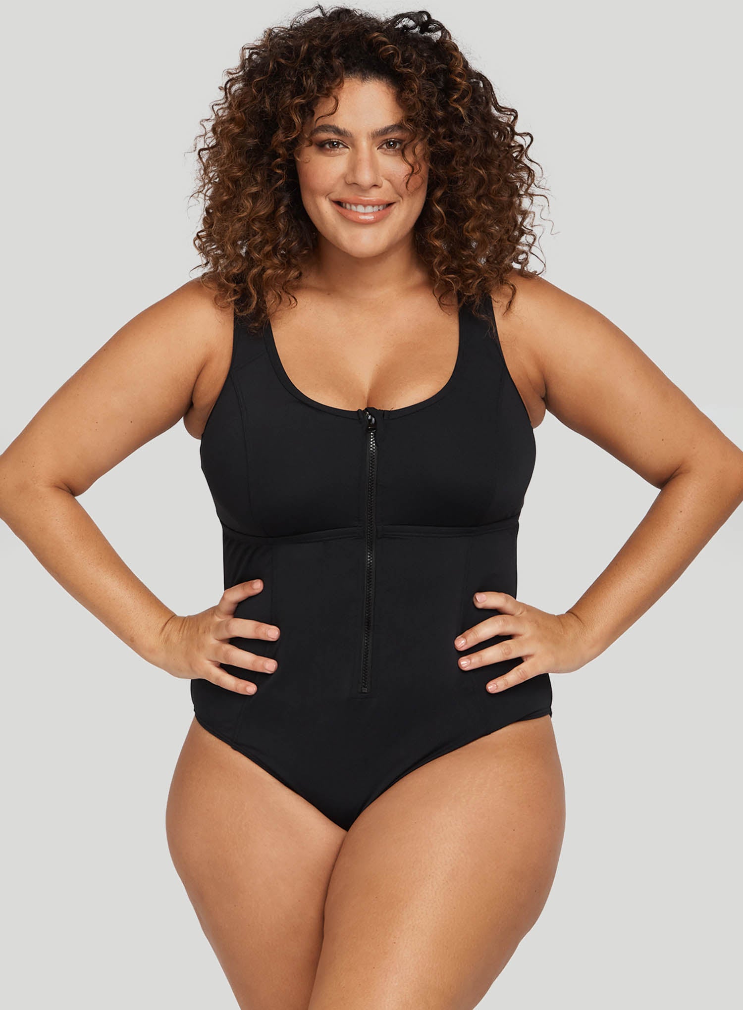The Fuseli silhouette is fashionable and functional, it is a zip front beauty. Not only does this swimsuit look stylish on, the absolute most stylish part of this swimsuit is how easy it is to get into and get out of. The zip through fuseli swimsuit shape is designed to fit a multitude of women and has multi-fit soft foam cups to fit a C - DD cup.