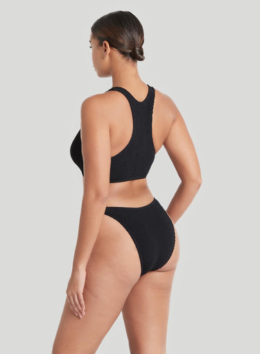 BOND EYE Scene Bikini Brief in Black Eco is the timeless new evolution of the Scene collection. Featuring incredible softness and luxurious shine, this is a must-have all year round. This exclusive knit fabric shimmers under the sun for an unmatched glow that will elevate your poolside look.