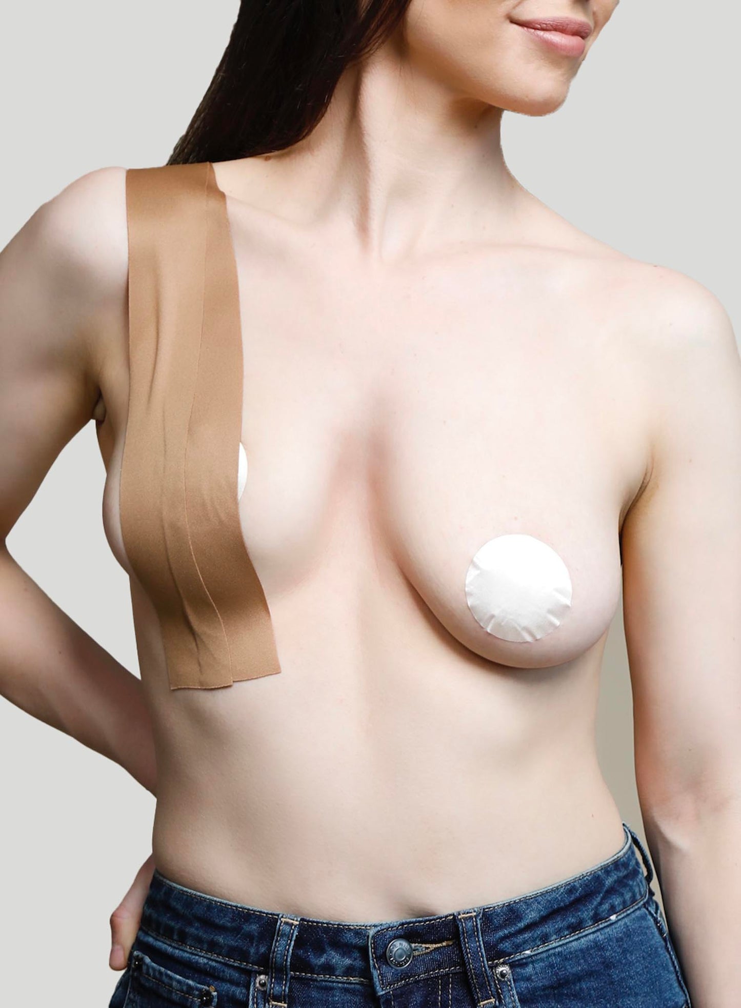 - Slowly pull off the rest of your adhesive cover as you press down, securing the adhesive into place. Cut as many pieces as you require and continue following the steps until you have achieved desired support and coverage. For enhanced support, our breast tape may benefit from extended side anchors, and additional pieces can be utilised for added reinforcement.