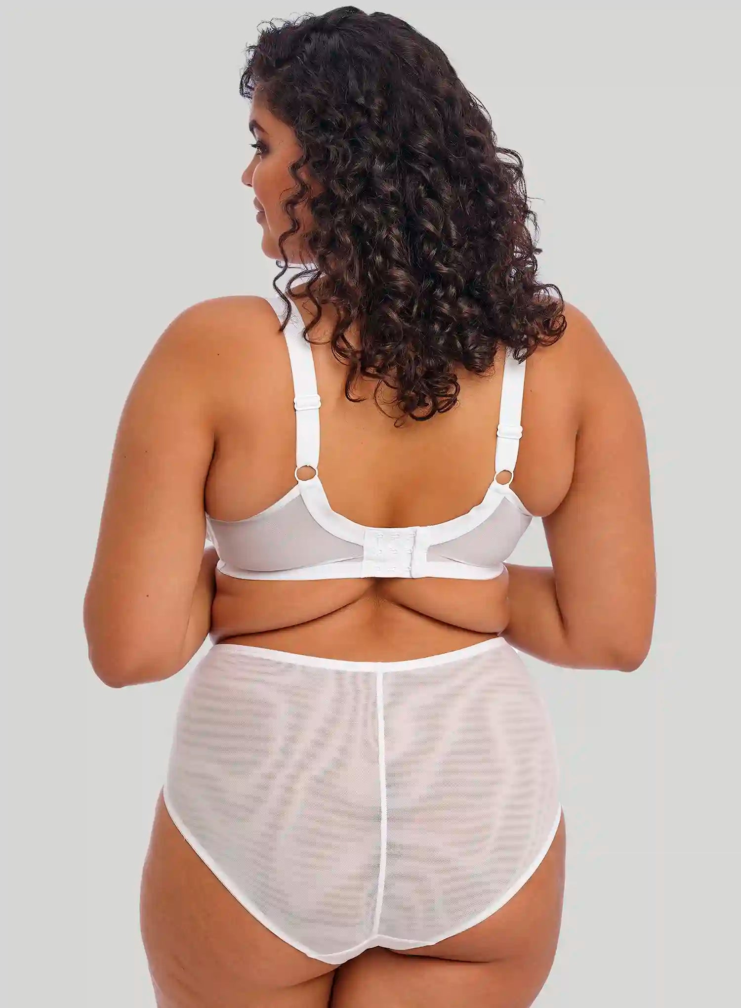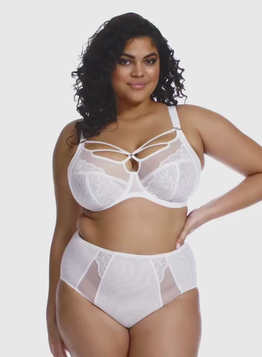 ELOMI BRIANNA Underwired Plunge Bra White is a stunning, fashion-forward addition to the Brianna collection. With its flat lace and floral design, this bra creates a feminine, confident look, while strappy cage detailing at the centre front adds modern sophistication—perfect for low-cut tops or as a statement piece on its own.