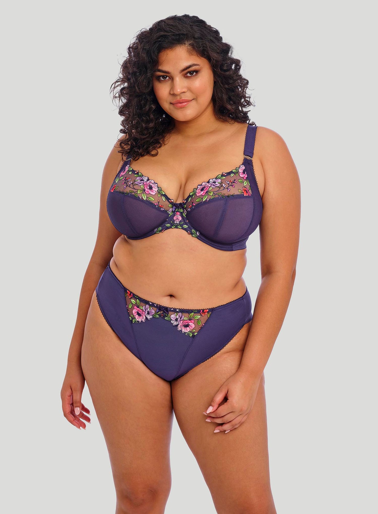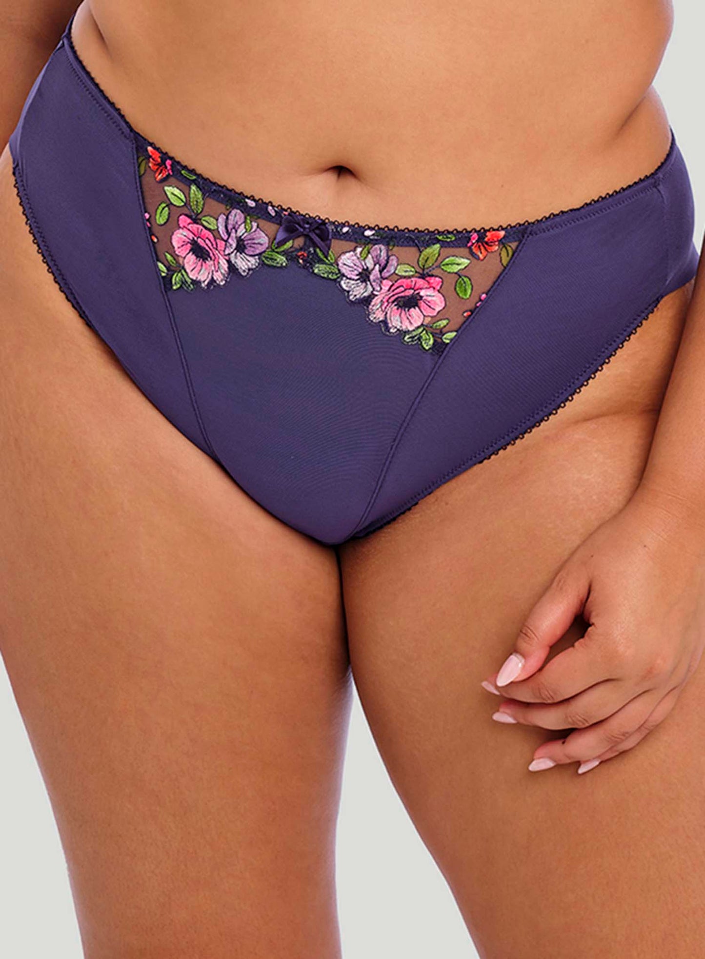 ELOMI Himari Brazilian Brief in Midnight returns with a fresh energy, inspired by the vibrant hyper-tropical haven trend. Featuring precision print technology, this design creates a striking 3D effect, bringing lush tropical florals to life in all the season’s must-have hues.  A new dramatic style of embroidery is taking centre stage, crafted using precision print technology for a unique 3D look. A cheeky leg cut combined with Elomi’s classic soft handle mesh, Himari will have you channeling springtime all year round.