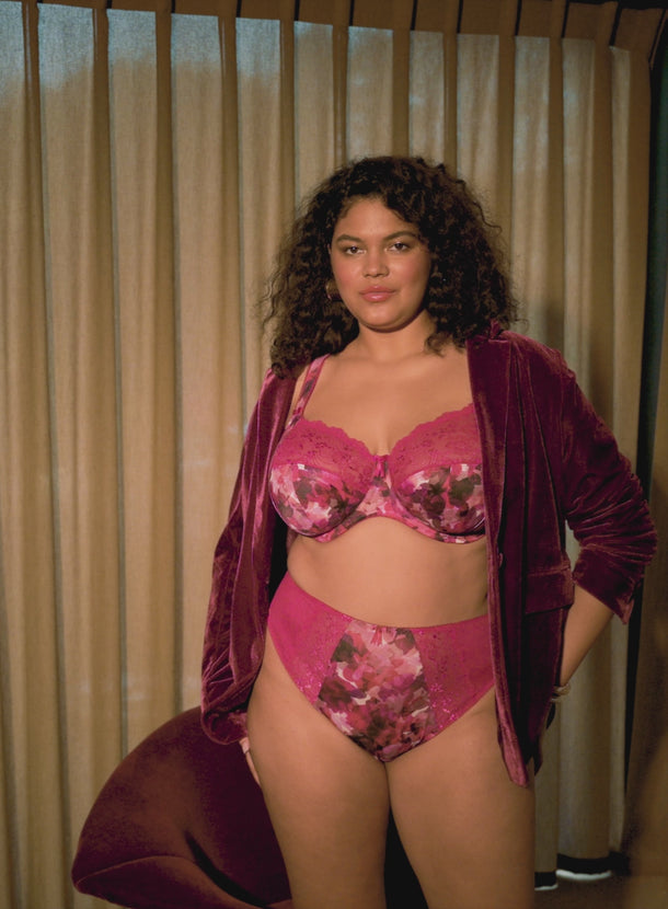 ELOMI Morgan High Leg Brief in Berry Crush welcomes a mood-boosting pop of colour to your wardrobe, in which tones of reds, pinks and purples come together to create this stunning floral print. This design is printed on soft handle matte elastase fabric with stretch lace panels at the side front. Finished with bow detail at the centre front.