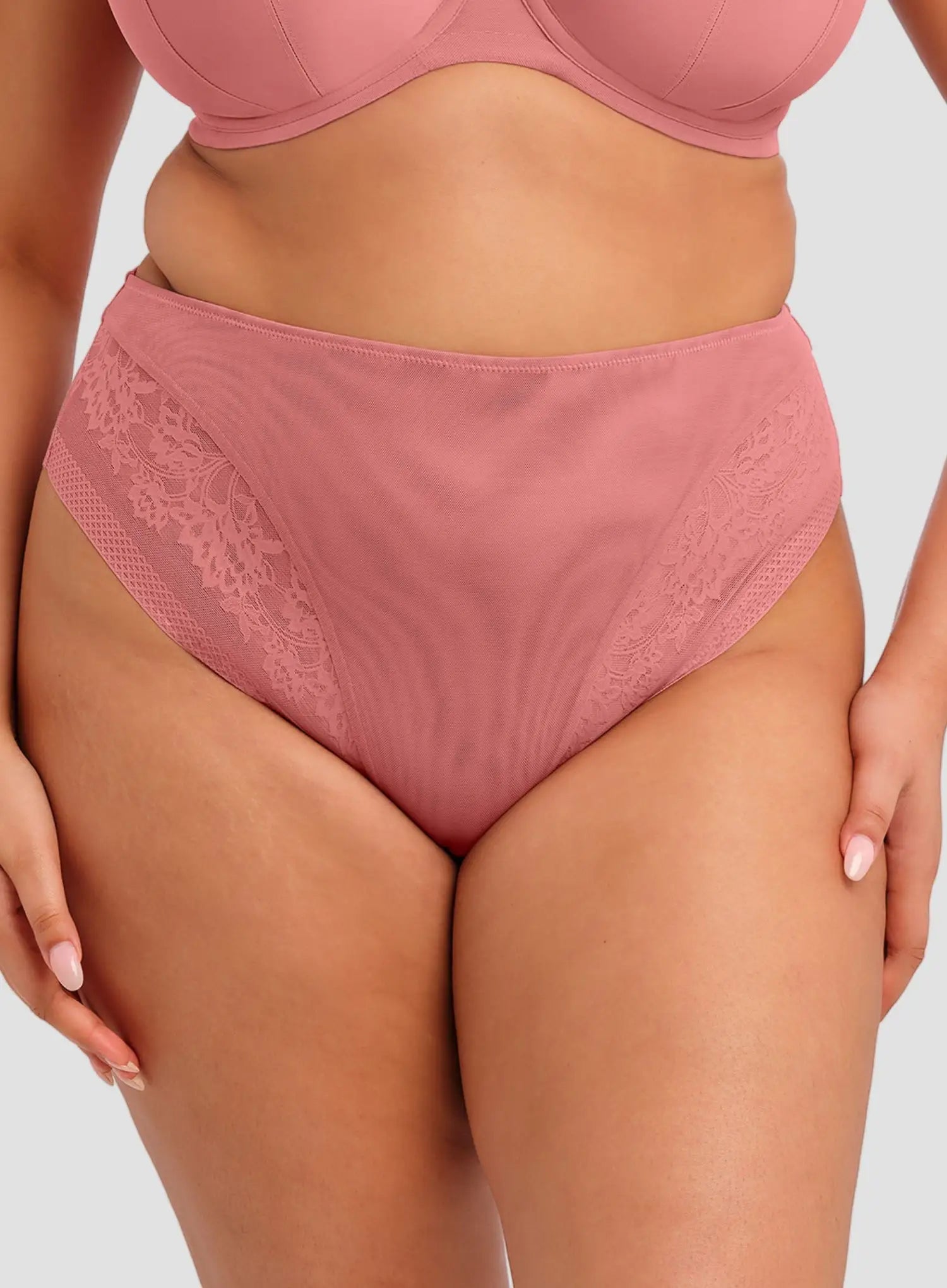 ELOMI Nerina High Leg Brief in Dusty Rose combines contemporary style with all-day comfort. Soft, double-layer stretch mesh at the front and back provides modesty, while powerful stretch lace along the leg edges offers a smooth, flat, matt finish with no VPL.