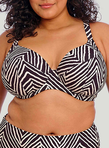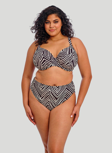 ELOMI SWIM Fiji Falls Underwired Plunge Bikini Top Black is a curve fit essential, combining bold style with Elomi’s signature lingerie-level support. Featuring a striking black zebra-inspired print, this bikini top is based on Elomi’s best-selling plunge bra shape, designed specifically to lift, shape, and flatter fuller busts. The neckline includes concealed elastic for flexibility and comfort, while the cups are fully lined in a light but supportive fabric that offers the look of a bikini with the fit of a bra. Powernet lining through the back provides extra support, and LYCRA® XTRA LIFE™ ensures the fabric stays looking and feeling great wear after wear. Adjustable straps let you customise your fit, making this a standout style for confident summer dressing.