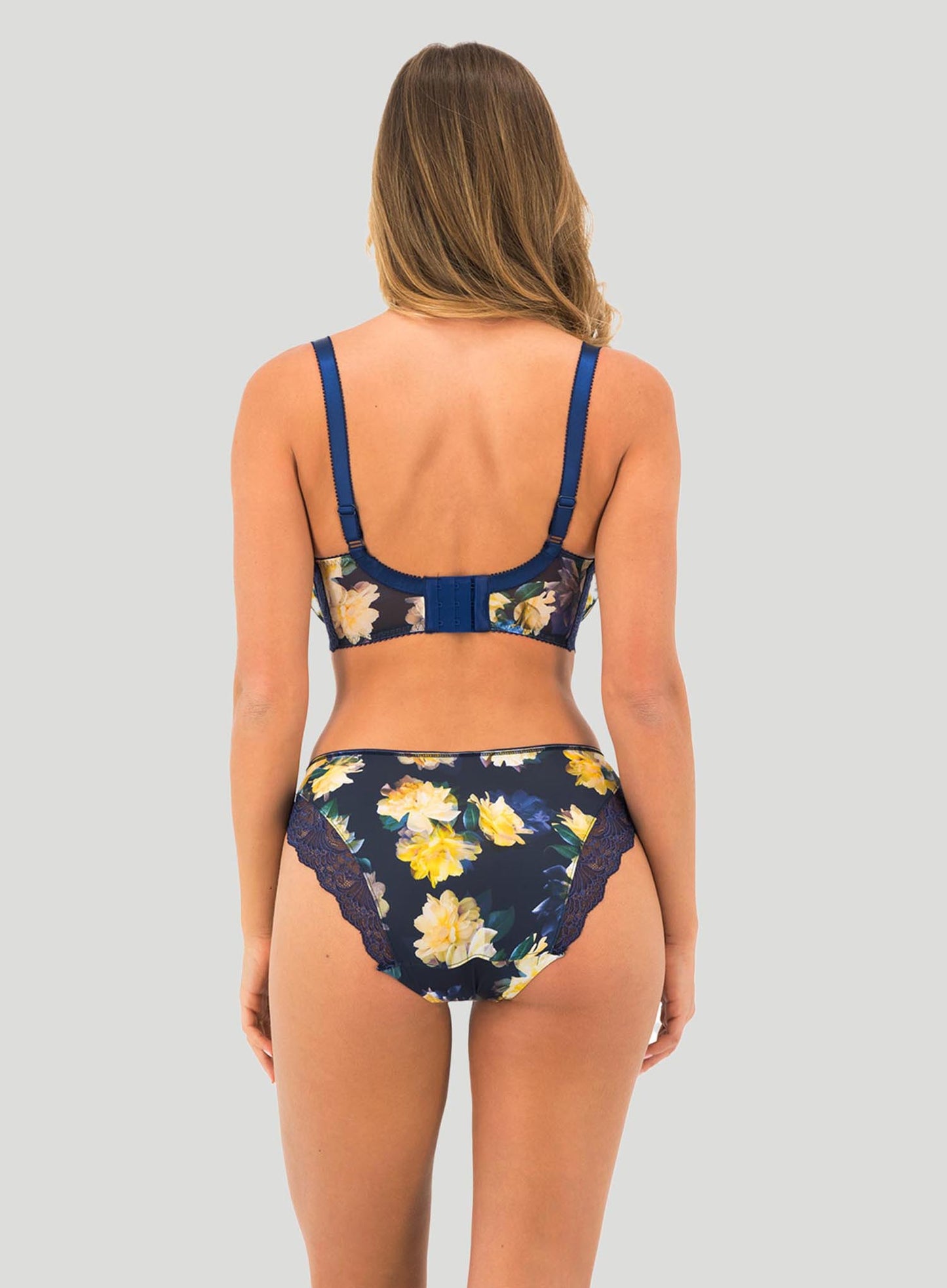 FANTASIE Lucia Brief in Navy features a bespoke floral print in buttermilk creams and lemon blooms over a navy backdrop. The stretch lace adorns the front and back leg and the design is finished with delicate bow detail at centre front. This sophisticated collection is perfect for a summery garden look.