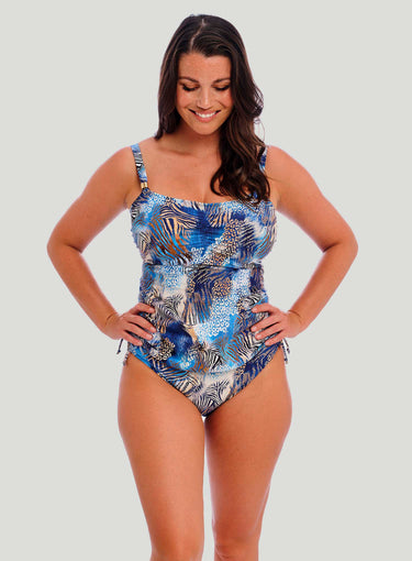 FANTASIE Seraya Sands Underwired Adjustable Side Tankini Denim is a centerpiece for DeBra’s this upcoming summer. This spectacular print features abstract animal prints with rich blue hues and striking bronze highlights. Designed to support and flatter, this design is based on the tried-and-true existing Fantasie Swim core collection that remains a favourite at DeBra’s. The concealed underwire gives this top all the support of a Fantasie Lingerie bra. Featuring a gold trim and ring detailing across a selection of styles, Seraya Sands is a real stand out collection for this or any season.