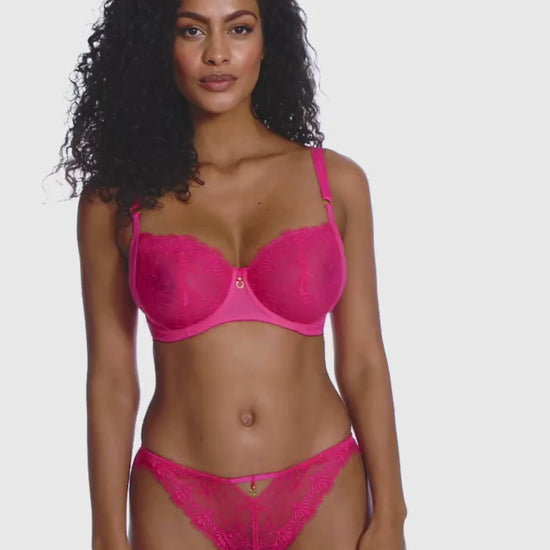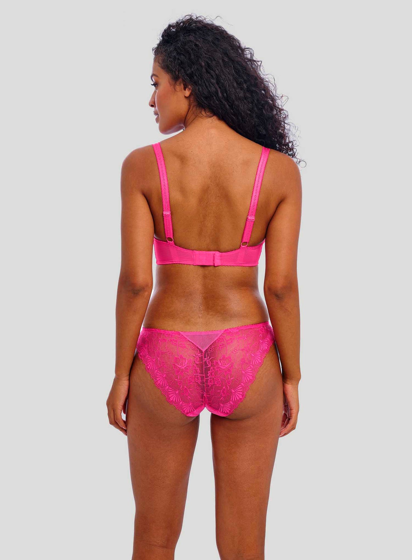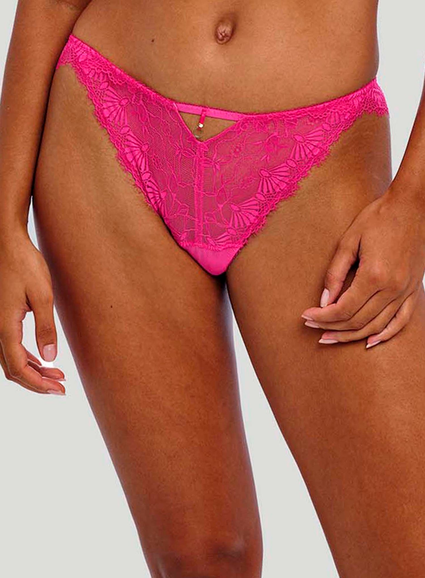 FREYA Fascinate Brief in Hot Pink is the perfect mix of sophistication and everyday wearability. Crafted with stunning eyelash-edge lace across the full front and back, this brief offers a soft and feminine aesthetic with a touch of drama. The scalloped lace back ensures a smooth, no-VPL finish, while the keyhole detail at the front adds a flirty touch. Complete with a metallic ring and ribbon charm at the centre front and a lined gusset for comfort, this piece is as beautiful as it is practical.