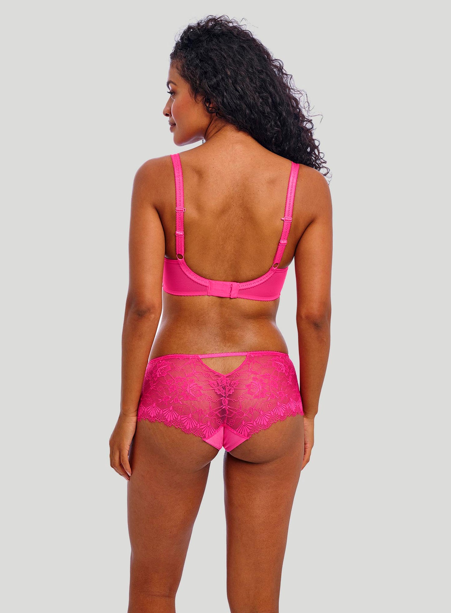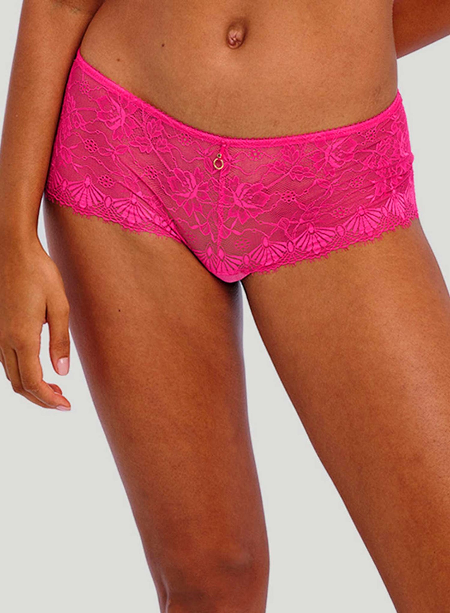 FREYA Fascinate Short in Hot Pink takes comfort and style to new heights with its exquisite eyelash lace covering the entire body of the short. Decorative mesh details add a contemporary edge, while the scalloped lace back ensures a seamless, no-VPL finish. A playful keyhole detail at the back enhances its allure, and the metallic ring and ribbon charm at the centre front make for a stunning final touch. With a lined gusset for added comfort, this short is the perfect blend of sexy and wearable.