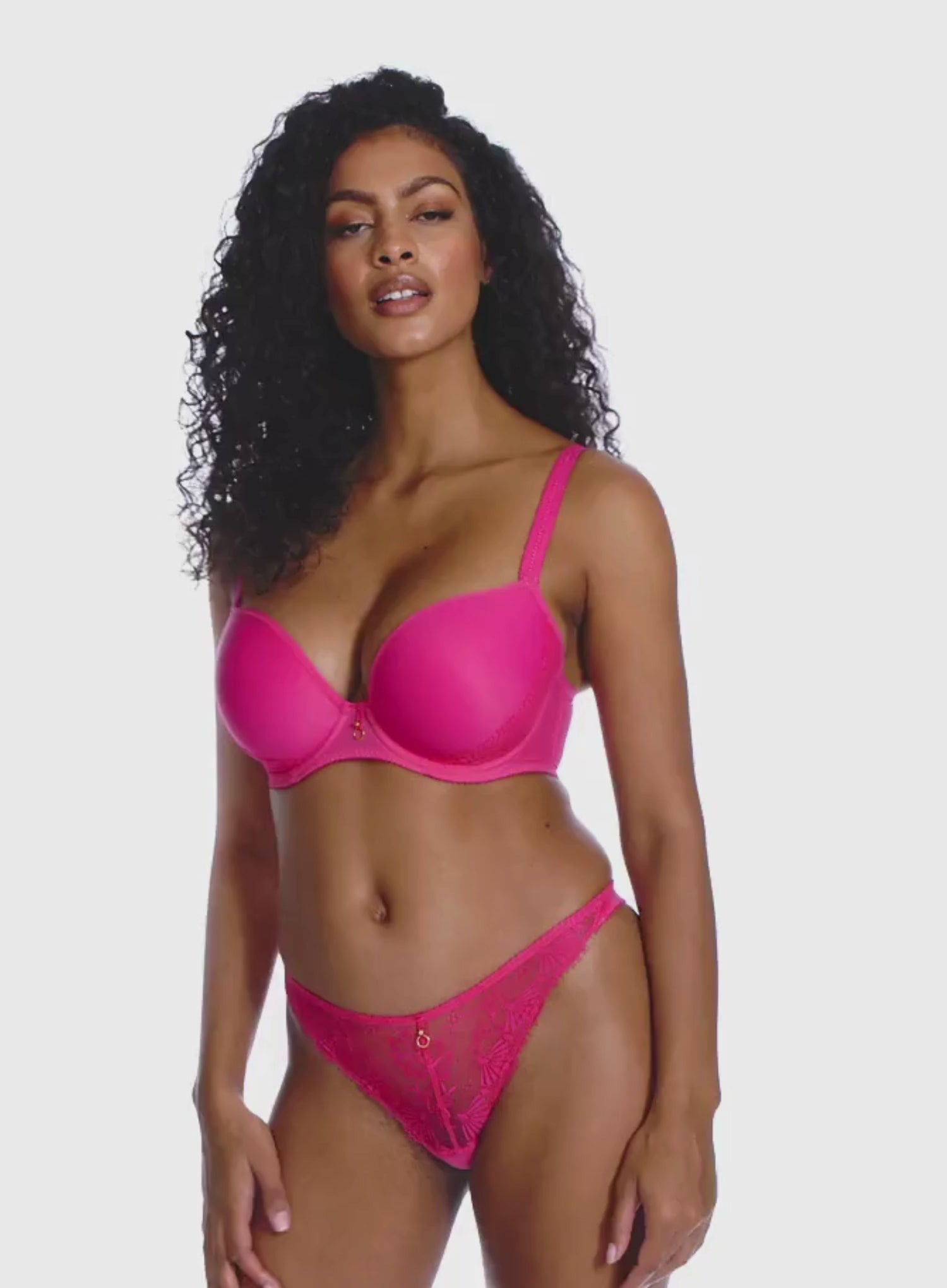 FREYA Fascinate Thong in Hot Pink is your go-to for a daring yet delicate lingerie look. Featuring exquisite eyelash lace across the full front and back in a flattering ‘V’ design, this thong is both pretty and sultry. Decorative mesh details add a modern touch, while the metallic ring and ribbon charm at the centre front bring a hint of luxury. With a lined gusset for all-day comfort, Fascinate is the perfect way to add a little boldness to your lingerie collection.