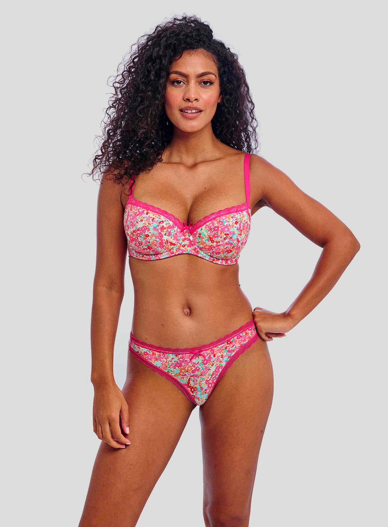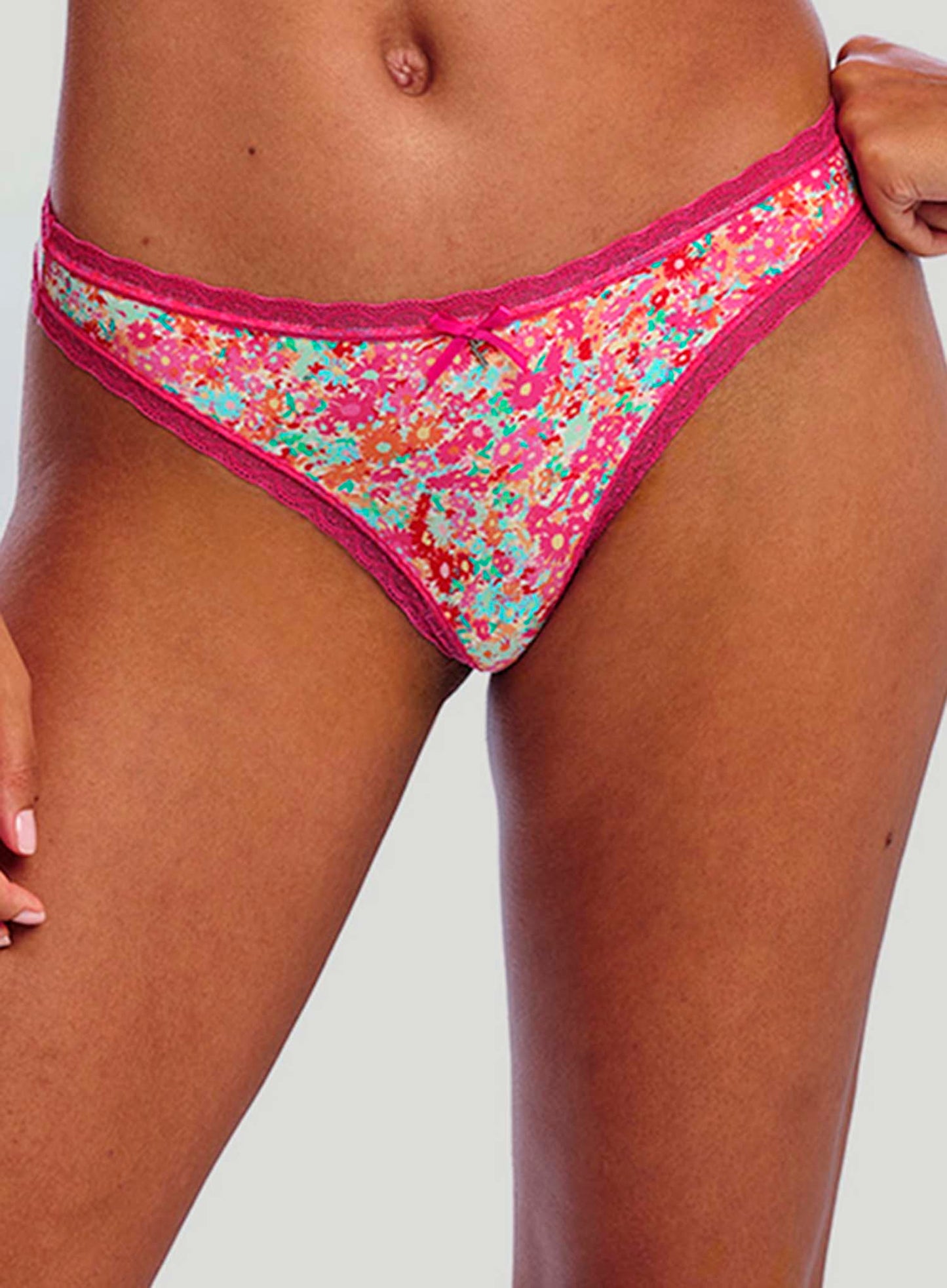FREYA Flirt Thong Hot Pink is part of our sweetest print collection yet! Featuring a multi coloured ditsy floral print accented with hot pink lace trim, this collection is feminine, flirty and fun. Even better, every style in this collection is crafted from ultra-soft TENCEL™ Modal Micro Air, delivering unmatched comfort from day to night. This thong style features a cheeky cut back and low rise waist for less coverage.