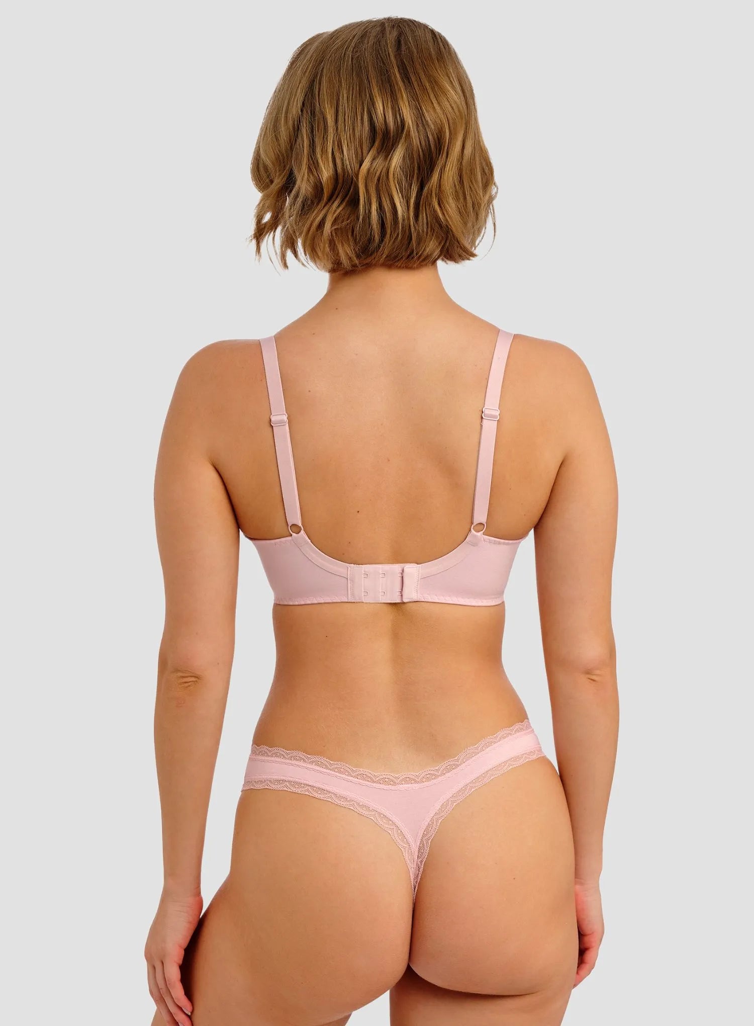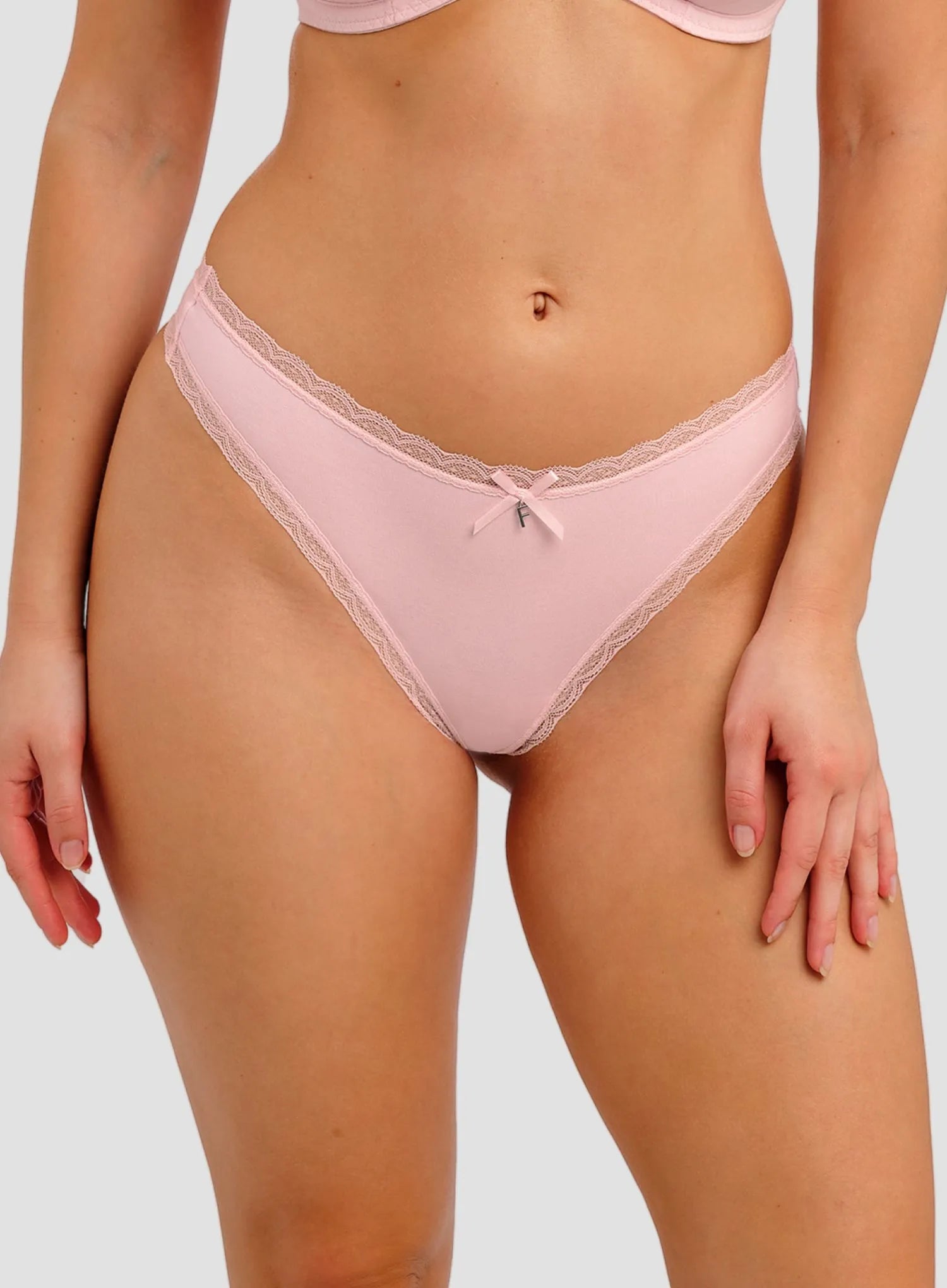FREYA Flirt Thong in Pink Frost offers a cheeky, playful take on everyday lingerie. Made from soft, opaque fabric with delicate lace trim, it sits slightly higher on the hip for a flattering fit and minimal back coverage. The subtle bow and signature charm bring feminine, flirty detail, while the lightweight fabric ensures all-day comfort. Pair with the Freya Flirt bra for a coordinated set that combines style, comfort, and a fun, confident vibe—perfect for lifting your everyday lingerie game.