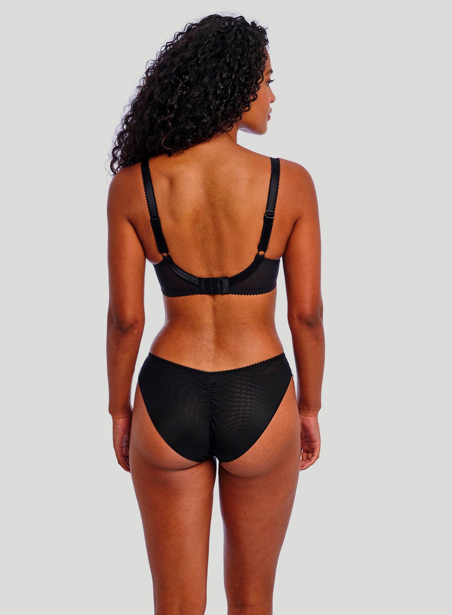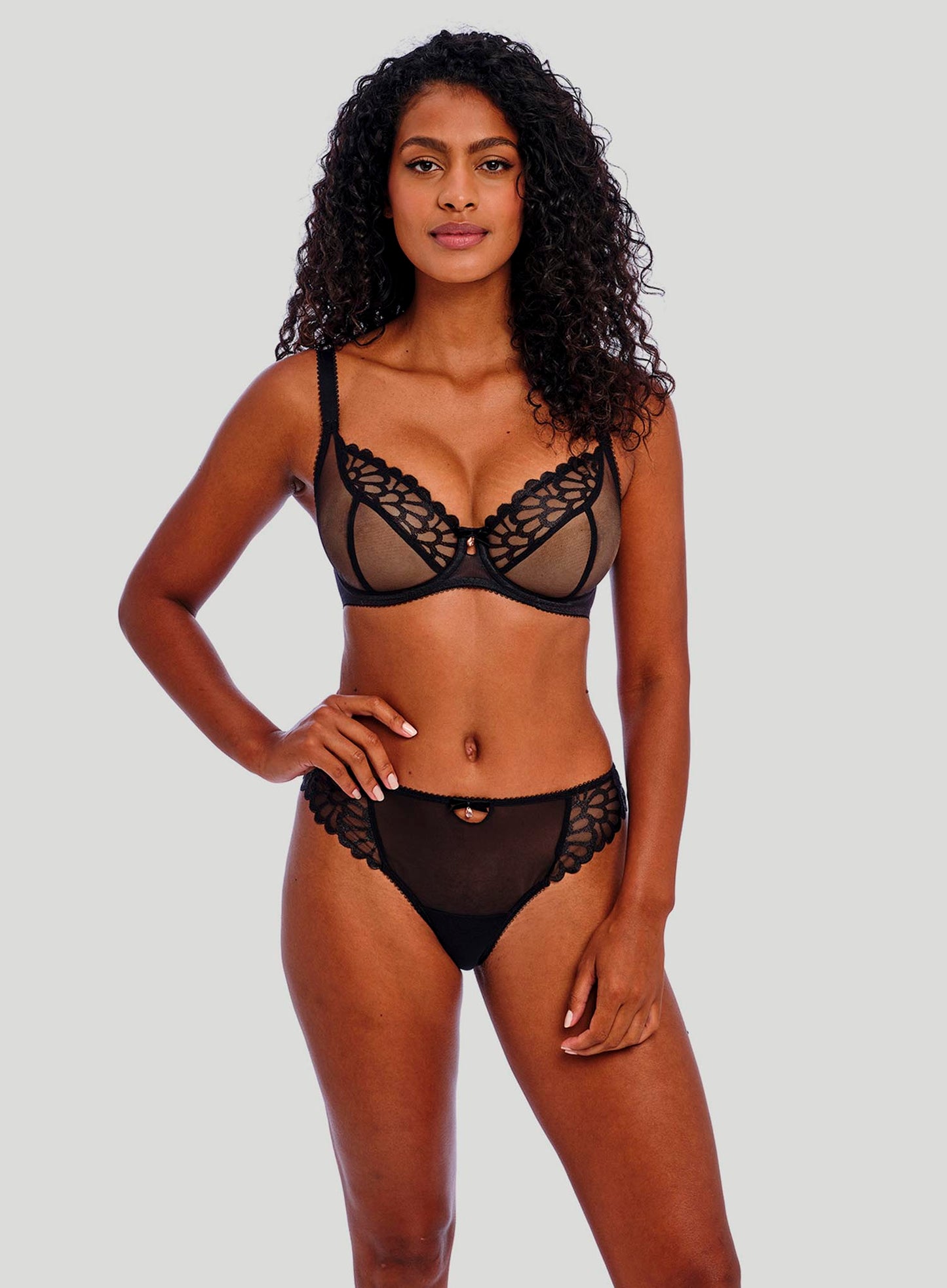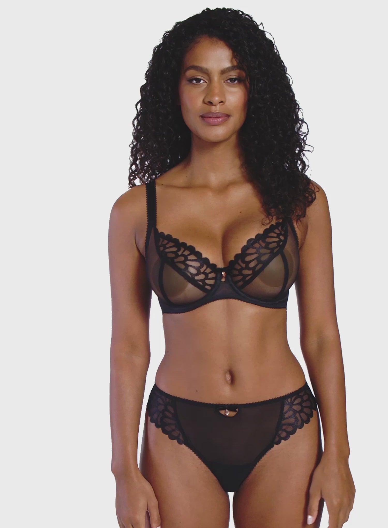 FREYA Loveland Underwired Plunge Bra Bombshell Black, a perfect blend of sophistication and allure. This stunning piece is designed for fuller-busted women seeking both style and support. Its underwired cups provide excellent support, while the plunge design creates a flattering silhouette. The luxurious fabric feels smooth against the skin, and the intricate lace detailing adds a sophisticated touch. Freya have enhanced the Art Deco design with a light Ciré effect, giving the embroidery a high-fashion, glossy finish. Whether you're dressing up for a special occasion or looking for everyday elegance, this bra is your go-to choice.