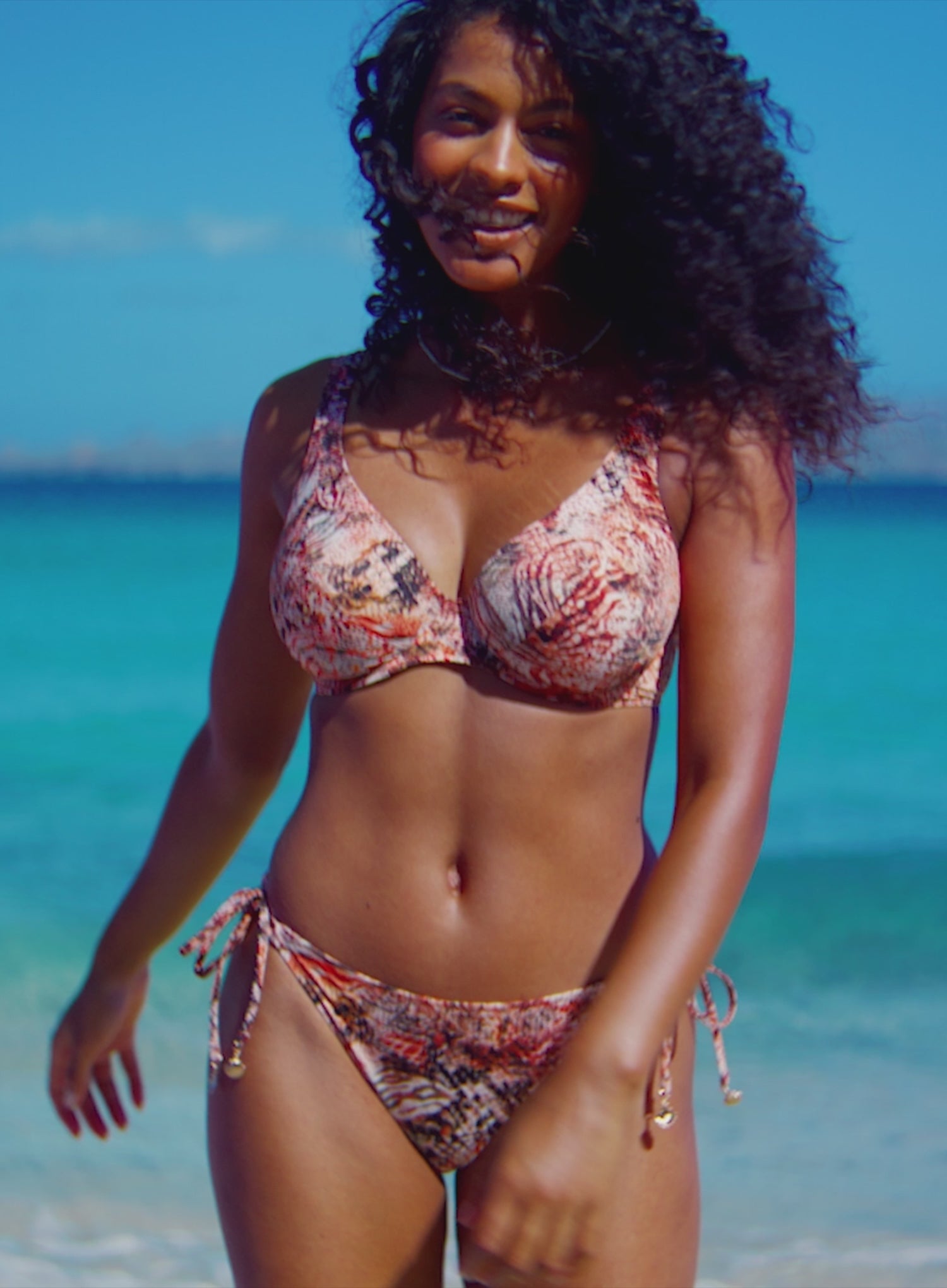 FREYA SWIM Desert Cat Underwired High Apex Bikini Top Sunset will have you taking a walk on the wild side this summer. This showstopping style features a bold animal print collection with striking mark-making in a fiery orange, accented by rich chocolate and deep black tones. This soon to be staple in your swimwear wardrobe features powernet lined cups for shape and support and a sexy low neckline that enhances cleavage for a stunning silhouette. Get ready to turn heads and feel fierce in this confidence-boosting collection.