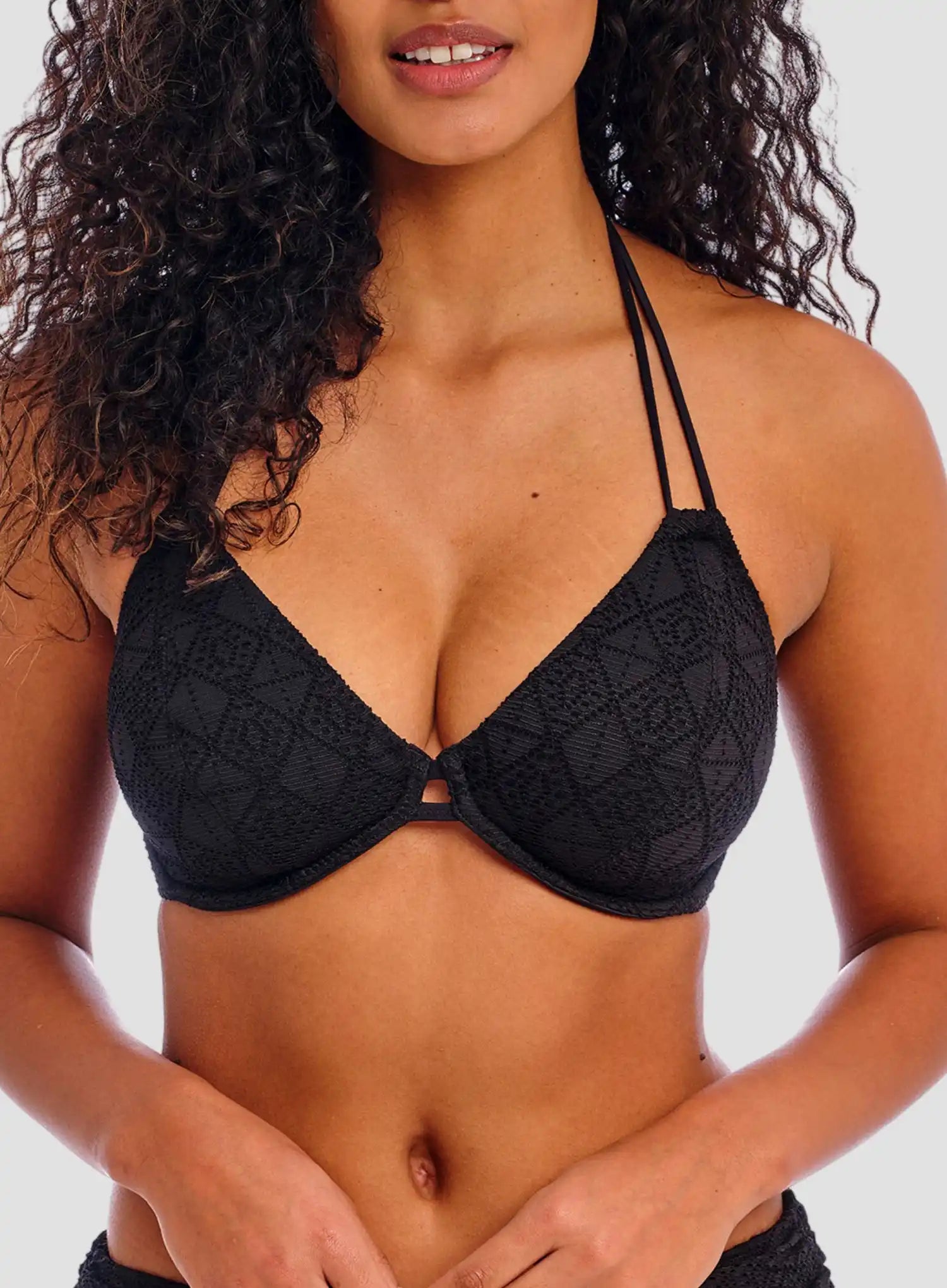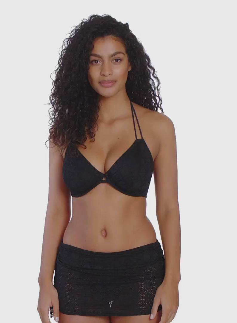 FREYA SWIMWEAR Nomad Nights Underwired Halter Bikini Top in Black is part of the new collection designed to offer something for every Freya girl. This soon to be staple in your swimwear wardrobe features powernet lined cups for shape and support and a sexy low neckline that enhances cleavage for a stunning silhouette. Underwired is complete with no cradle to give a lower coverage look. Finished with a crochet overlay for a stylish touch, get ready to complete your summer wardrobe with Nomad Nights.