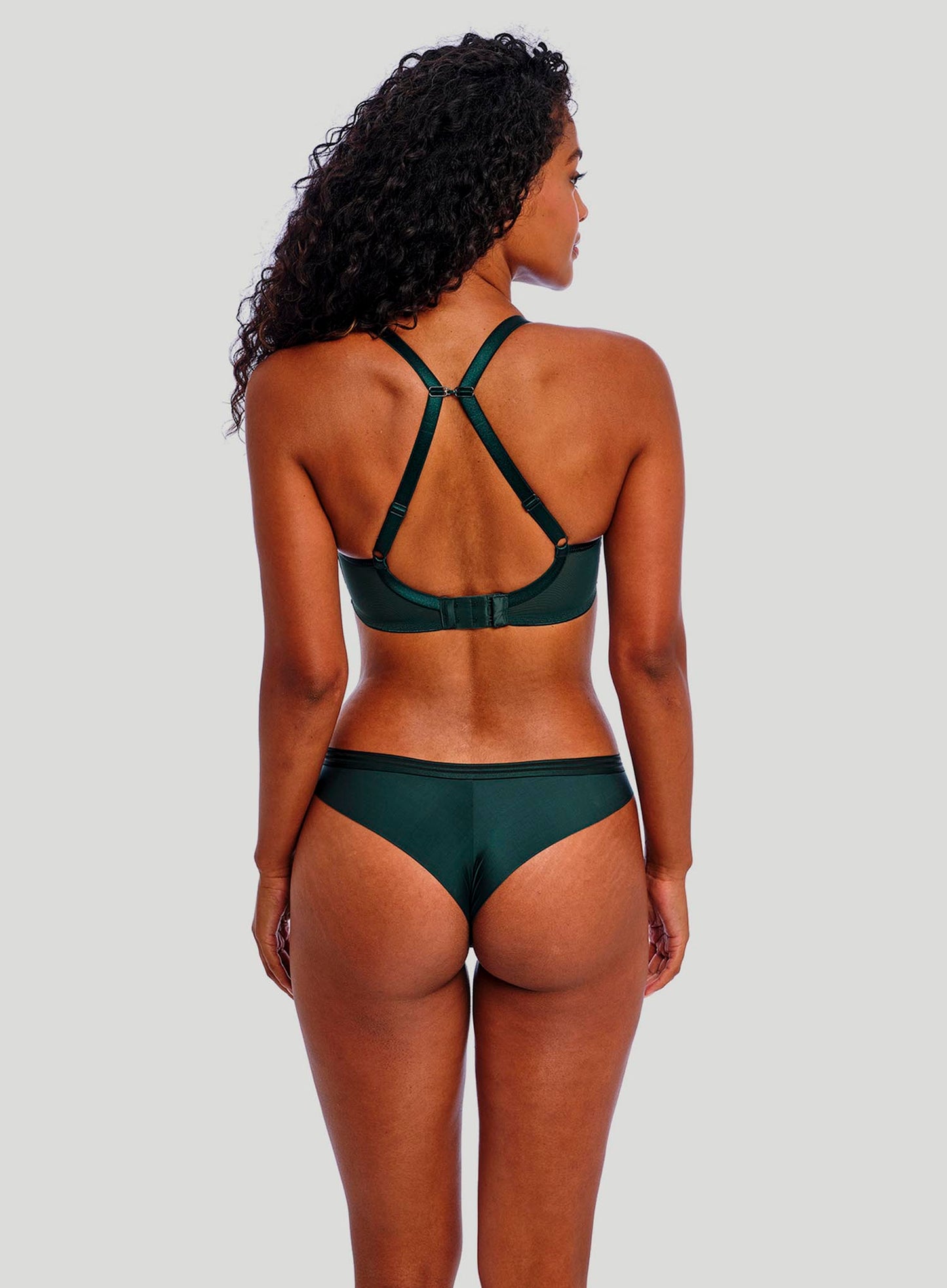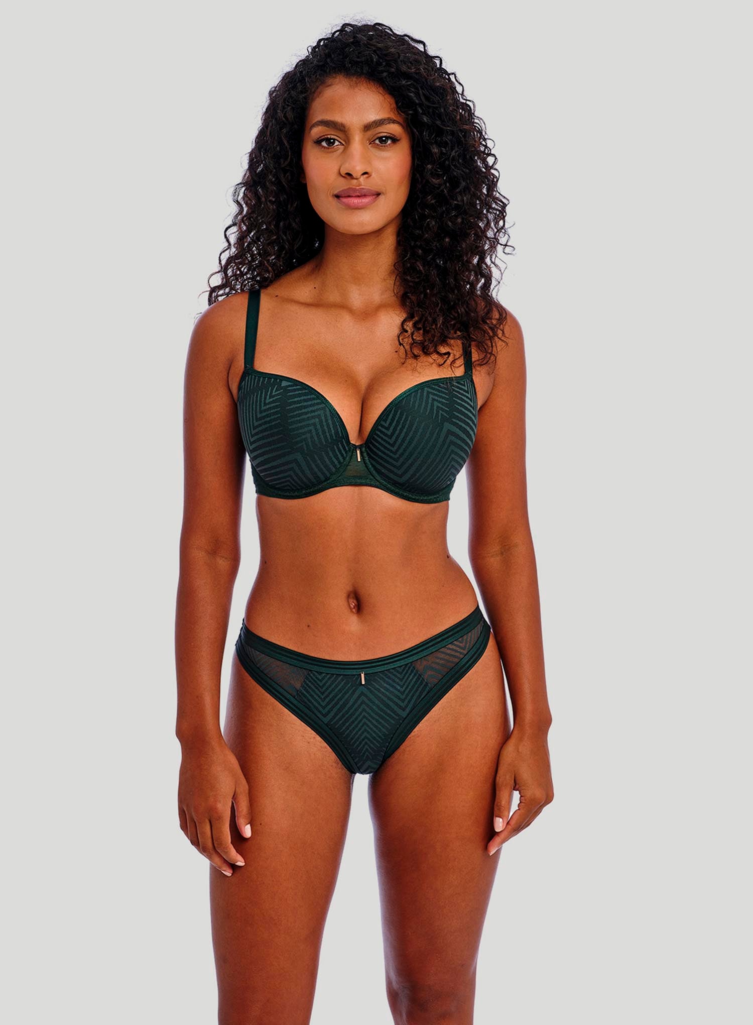 FREYA Tailored Smooth Moulded Plunge Bra in Deep Emerald takes this collection to a whole new level of on-trend styling. This design has a flattering low centre and moulded cups with a stretch geo-lace overlay for a smooth and rounded silhouette and great cleavage without overspill. The passionate deep green hue is accessorised with rose gold trims at the centre front of each garment for a tempting contrast. Just when you think a bra can’t get any better, the Tailored swoops in and steals the show. This colourway is not one to be missed!