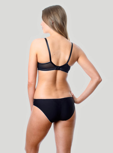 HOTMILK. Show Off Bikini Brief features a stretch and comfy micro fibre material that is comfortable enough to be worn all day. This bikini brief is framed with a soft, geometric lace that sits comfortably under growing tummies. it also features a nude lining and bow detailing.