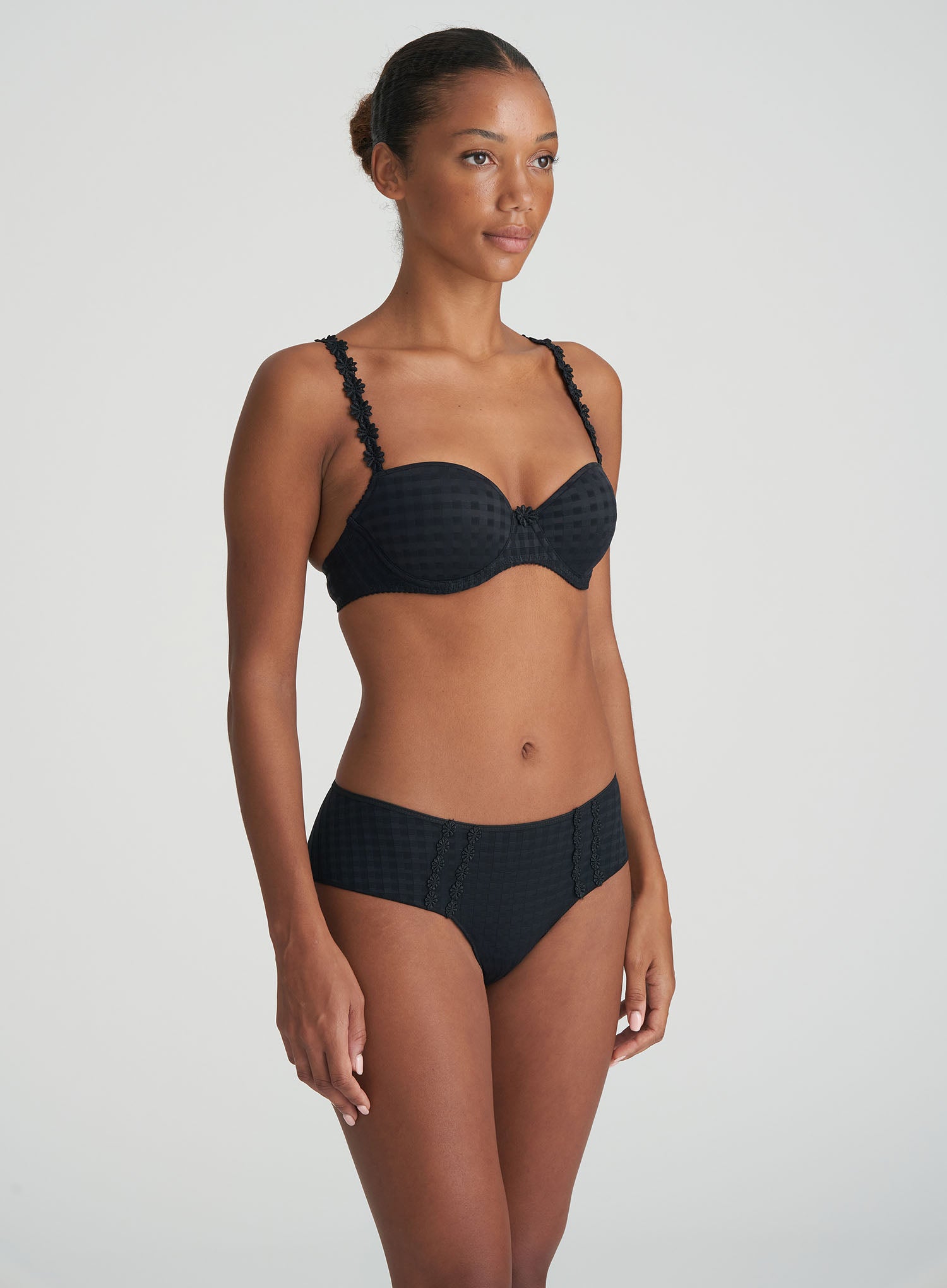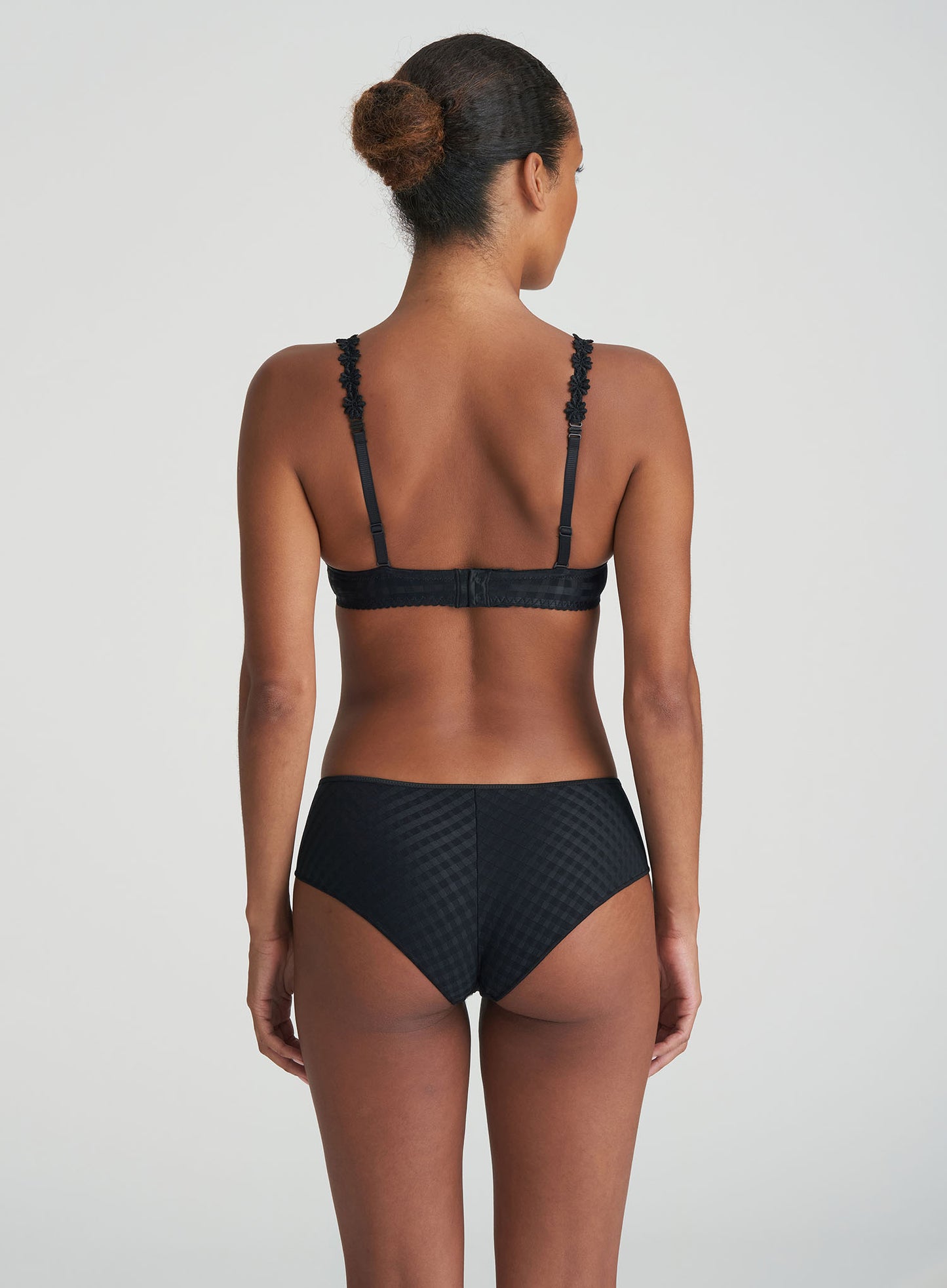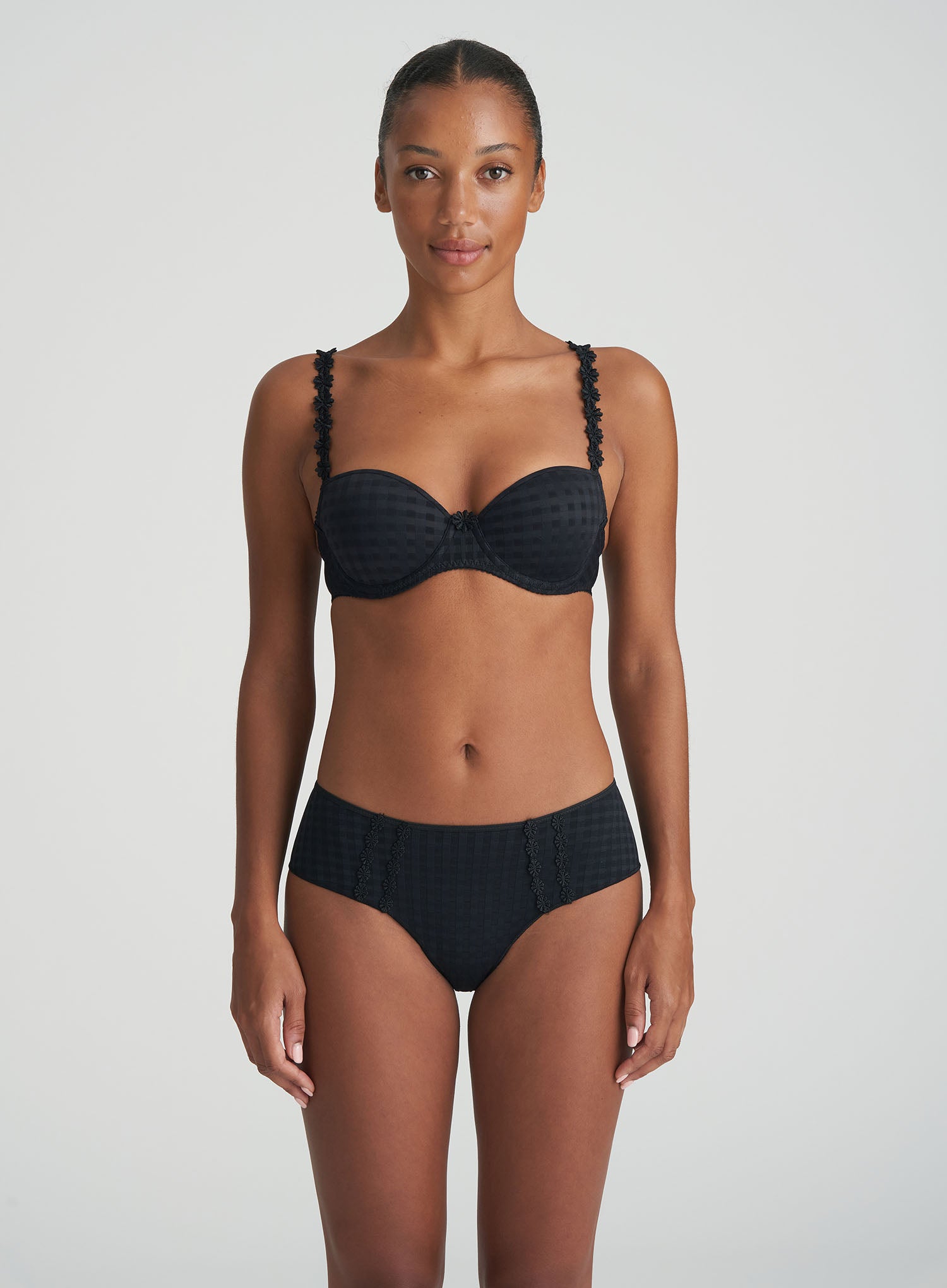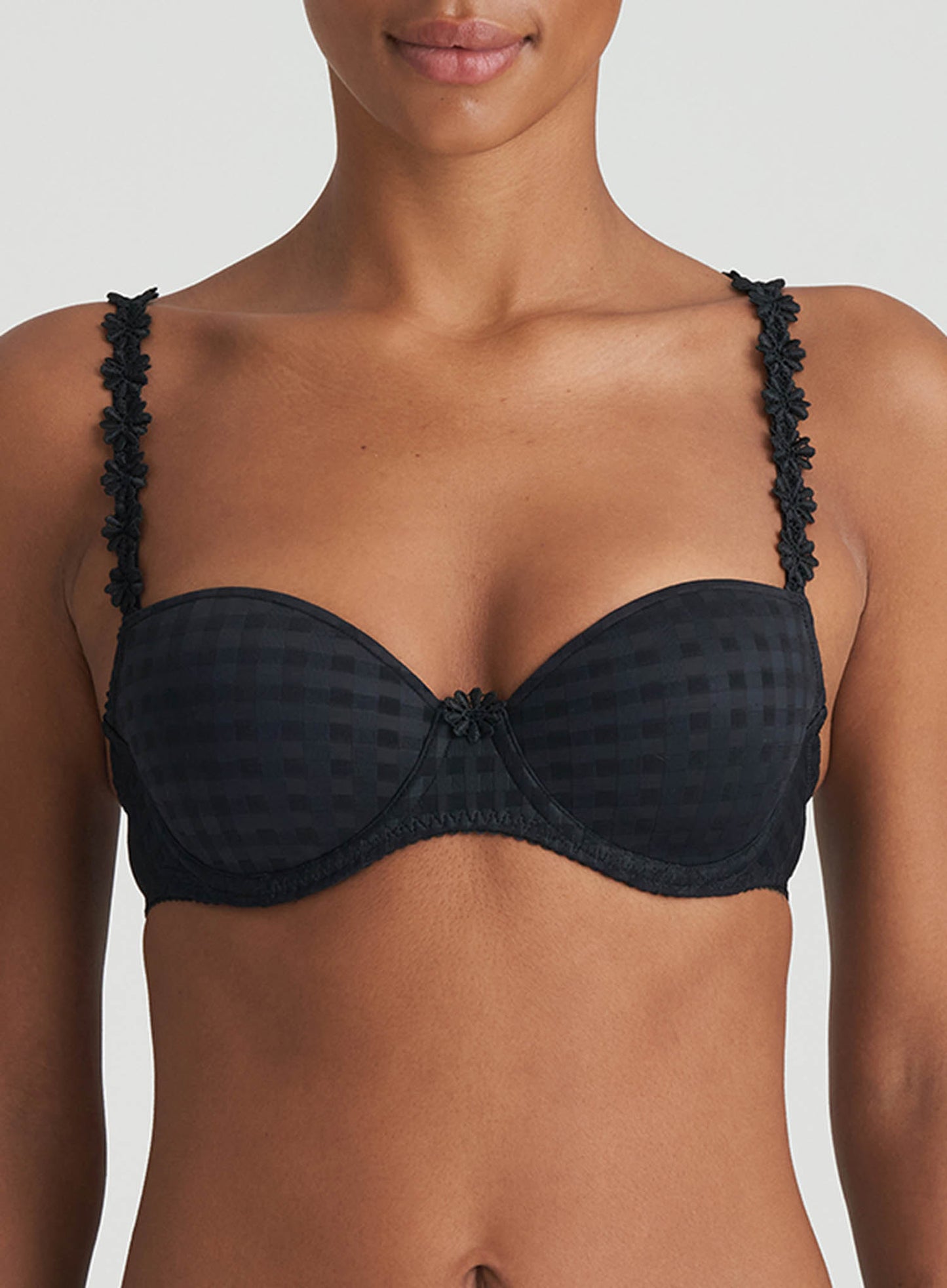 MARIE JO Avero Balcony Bra Black is a pre-formed, balcony style, padded bra with a fresh, youthful look. Featuring the signature Marie Jo Avero detailed straps, this is a must have summer look! The defining feature of this design is the centre panel between the breasts that sits higher than the classic Avero, providing both added support and extra uplift by enhancing the cleavage. If you are looking for a classic balcony bra that offers an beautiful lift and incredible shape, you can’t go past the Avero series.