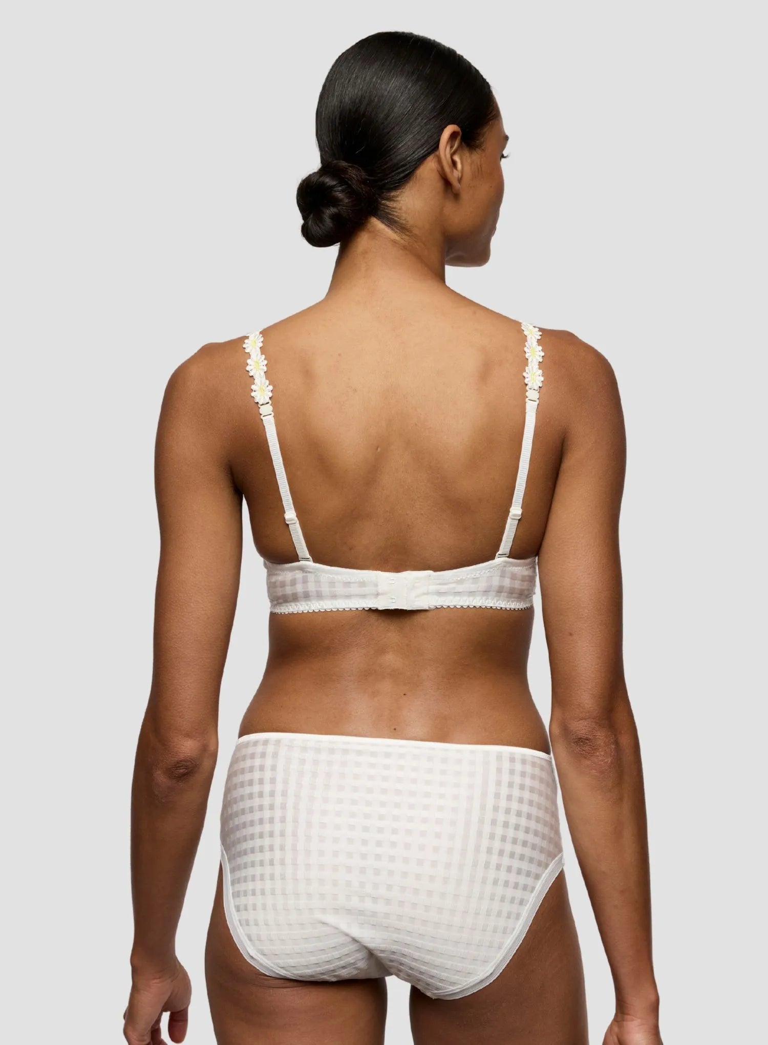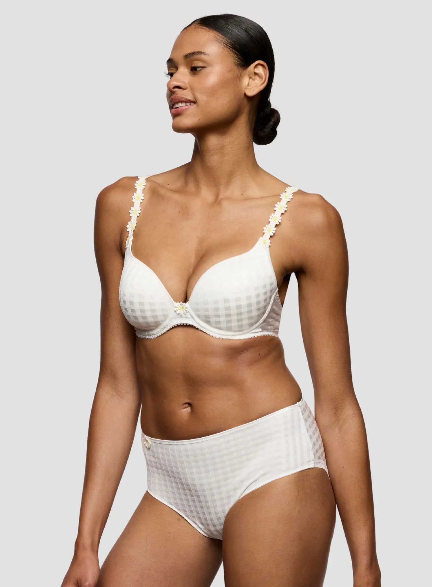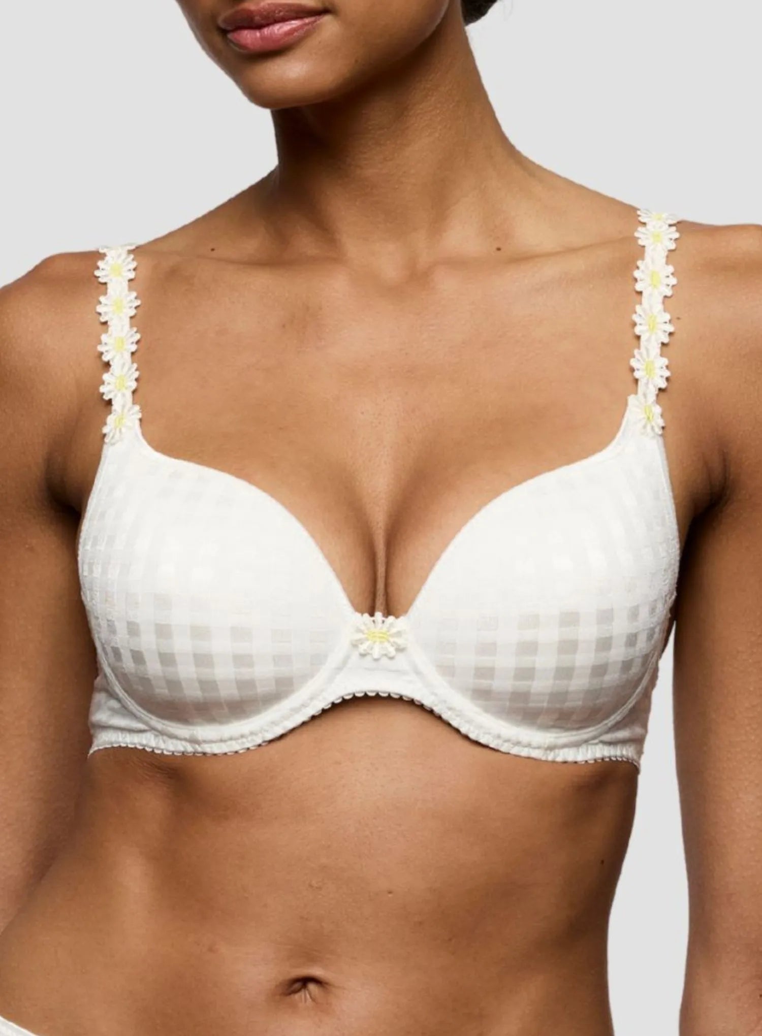 MARIE JO Avero Padded Heart Shape Bra in Ivory Petal blooms with fresh daisy-inspired colours, featuring a natural base enhanced with yellow guipure detailing along the shoulders. This pre-formed padded bra creates a flattering sweetheart neckline and youthful silhouette, perfect for a fresh summer look.