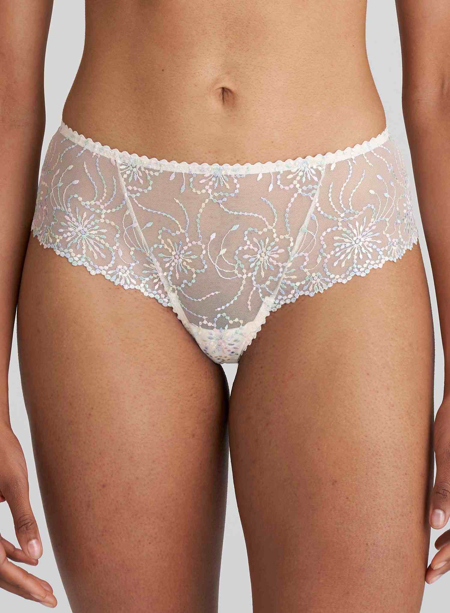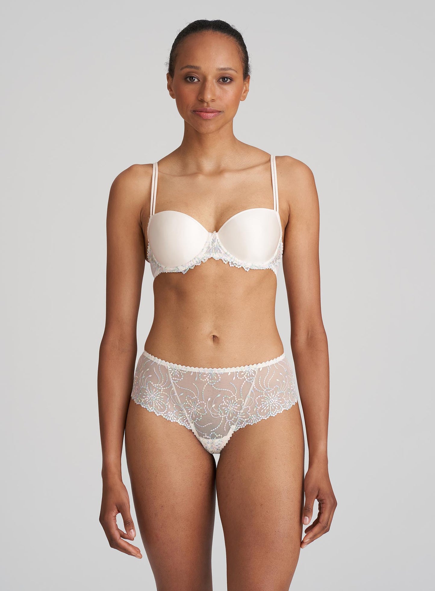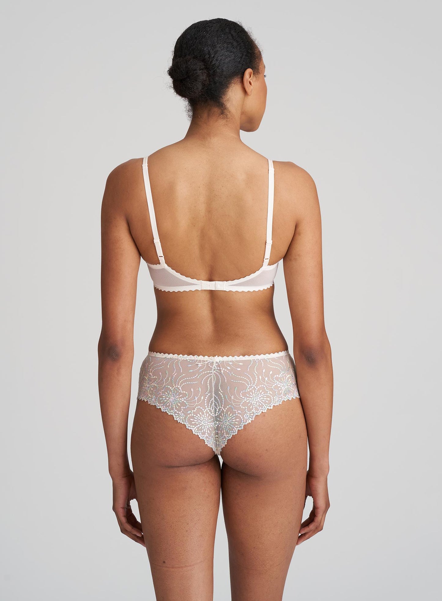 MARIE JO Jane Luxury Thong in Boudoir Cream offers a beautifully seductive design crafted from lightweight tulle and elegant, multicoloured embroidery. Wider at the front, this design also offers partial coverage in the back. Pair with the Marie Jane Push Up Bra or Padded Balcony Bra in Boudoir Cream for the perfect foundation for a stylish winter look.