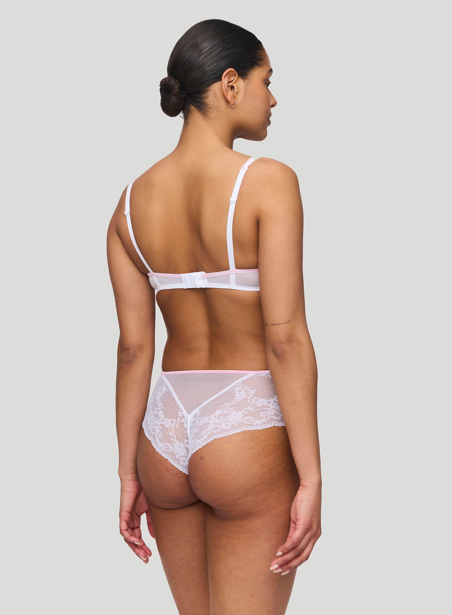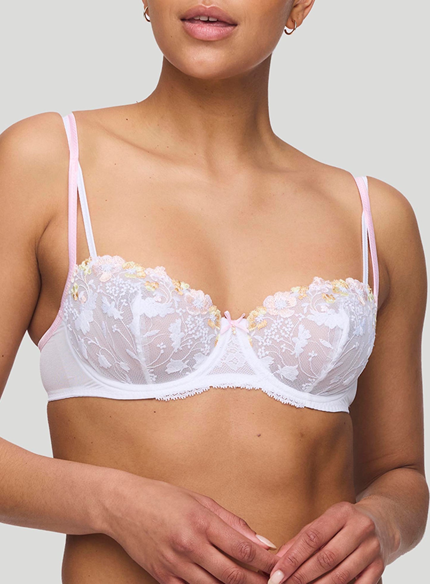MARIE JO Lizelot Vertical Seam Balcony Bra White was designed with the loyal fan of Marie Jo classics in mind. Matte white embroidery paired with vibrant yarns gives Lizelot a purely romantic look. This non-padded balcony bra is the highlight of this collection, with its low-cut cups, vertical seams and transparent design making for a truly sexy look. Double lined for comfort, the ultra-feminine balcony is super flattering, with its delicate lace detailing and cups that lift and centre for a flirty amount of cleavage.