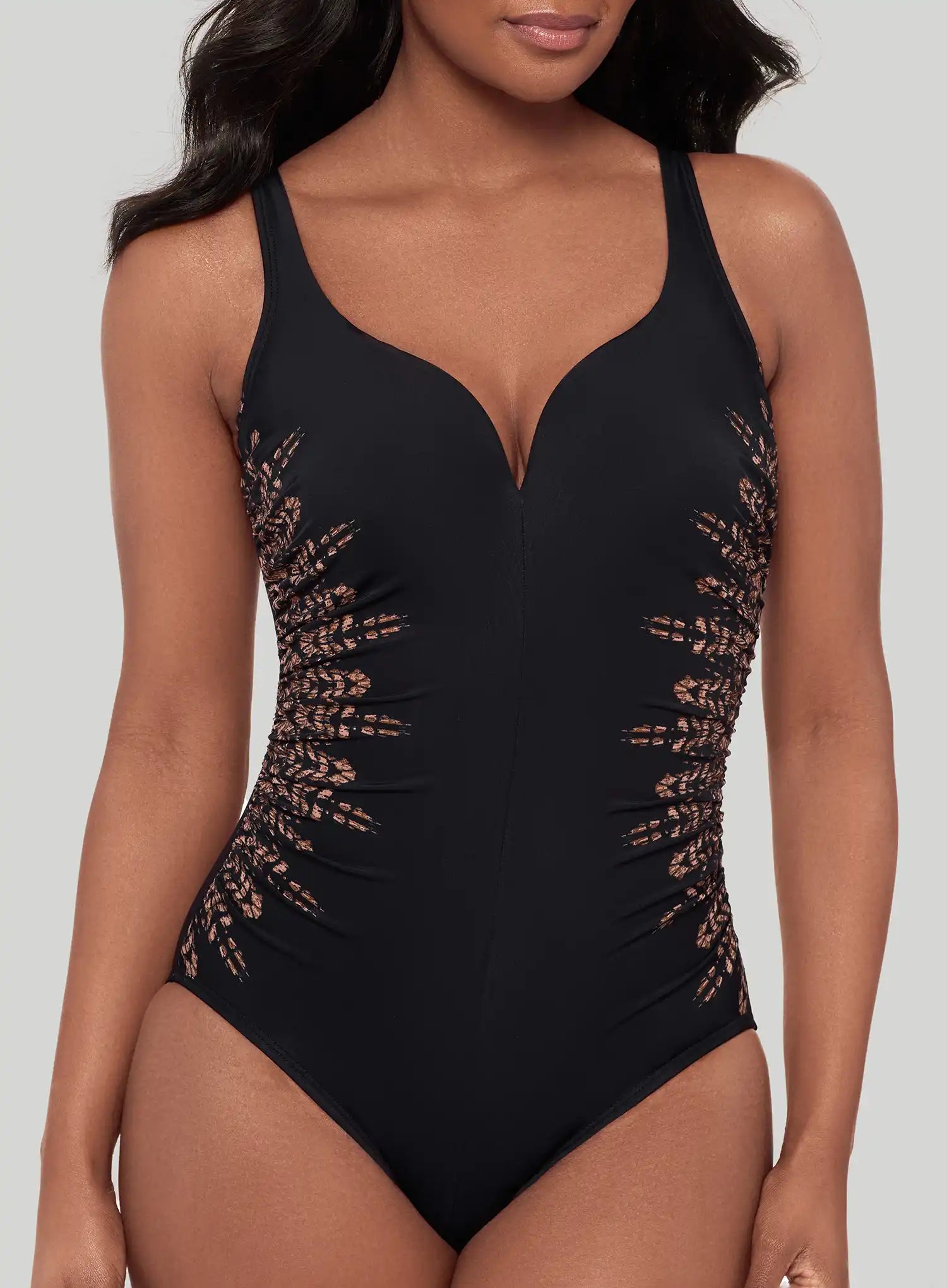 MIRACLESUIT Costa D Oro Temptress One Piece is a show-stopping swimsuit designed to sculpt and enhance your natural curves. The plunging V-neckline highlights the décolletage, while moulded underwire cups provide subtle lift and support. Featuring side shirring and an engineered print, it creates the illusion of an instant hourglass figure with confidence-boosting shaping that works from every angle.