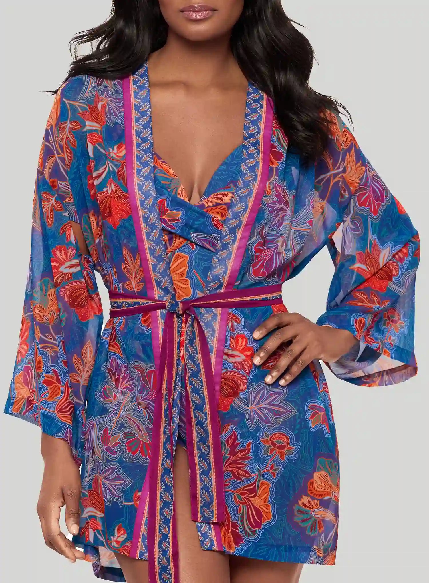 MIRACLESUIT Decoupage Kimono is a striking complement to the bright and bold Decoupage print, featuring a captivating floral design on a vivid azure base. Mid-thigh length and made from semi-sheer georgette, it can be worn open or tied with the fixed belt for a relaxed yet polished look. Wide, flowing sleeves add movement and an effortlessly chic finish.