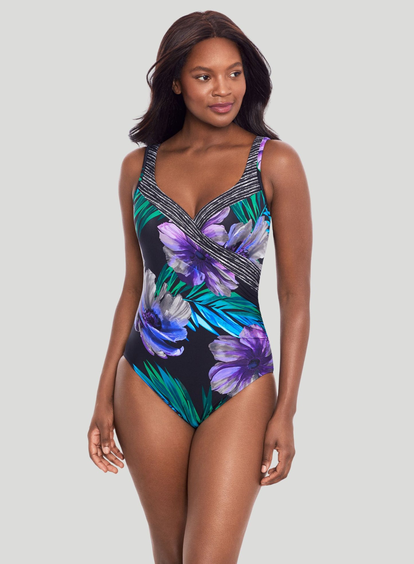 Miraclesuit Swimwear: Flora Aura Wrap Tummy Control One Piece Black Multi