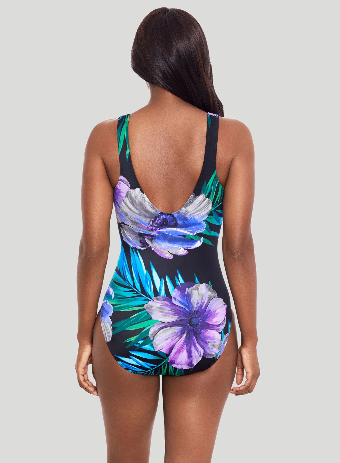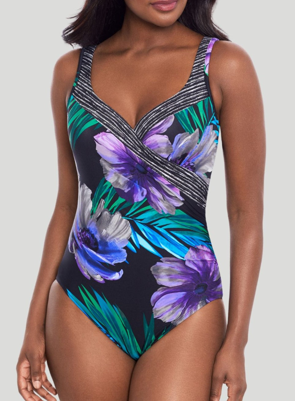 MIRACLESUIT Flora Aura Wrap Underwired Tummy Control One Piece in Black Multi combines elegant style with body-enhancing technology. The eye-catching floral print in vibrant hues of purple and green contrasts beautifully against a sleek black backdrop, making a bold style statement. Combining comfortable control fabric with the innovative Miratex technology, this suit shapes, slims, and enhances your silhouette. The molded foam cup bra with underwire, sweetheart neckline, and fixed padded straps provide excellent support, while the draped fabric conceals the tummy for a smoothing effect.