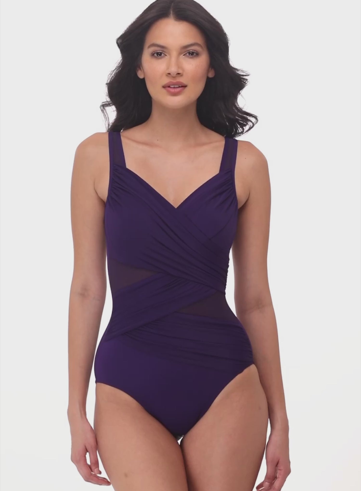 MIRACLESUIT SWIMWEAR Network Madero Underwired Shaping One Piece Mulberry is your perfect companion for a confident, stunning poolside look. Designed to sculpt and enhance your natural curves, this swimsuit is made from powerful Miratex fabric, offering firm all-over smoothing and slimming with just a single layer. The flattering ruched crossover design and triangle mesh inserts work together to create the illusion of a smaller waistline, while the hidden underwire provides essential lift and support for your bust. With its blend of shaping technology and elegant detailing, the Madero swimsuit is sure to make you feel effortlessly confident and beautifully put-together wherever your swim adventures take you.