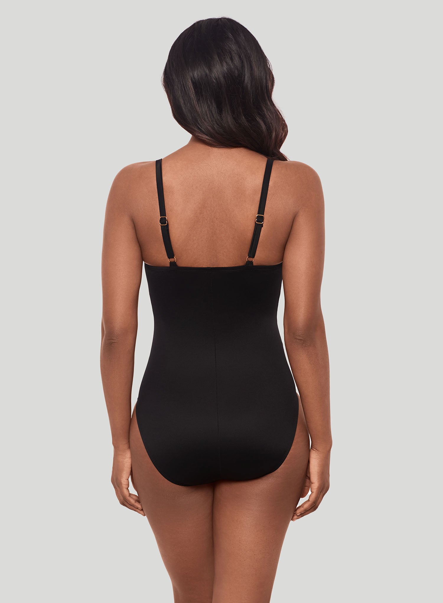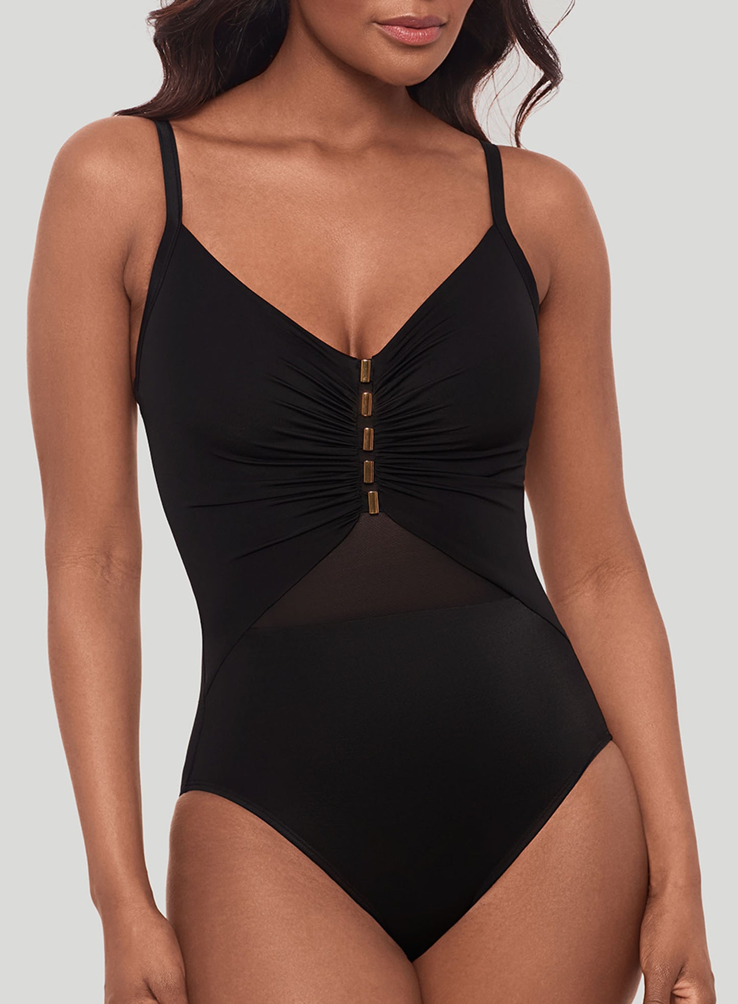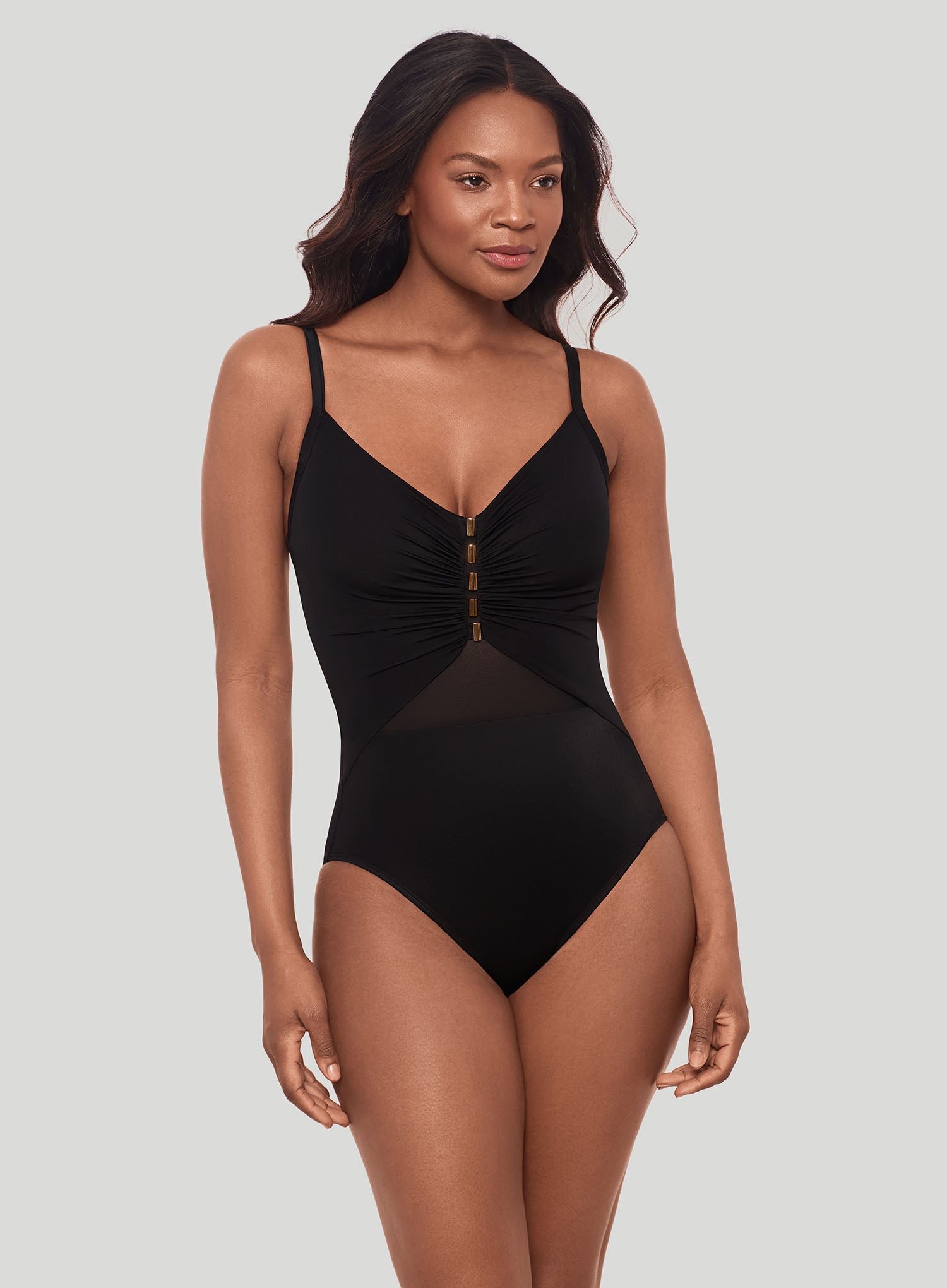 MIRACLESUIT SWIMWEAR Network News Mariposa Underwired Shaping One Piece Black is a chic new addition to the Network collection, known for its sleek mesh panelling and slimming effects. The Mariposa style combines elegance and support, with a flattering ruched bust detail accented by gold hardware for a touch of glamour. Crafted from Miraclesuit's signature Miratex fabric, this swimsuit sculpts and smooths your figure without the need for additional linings. The strategically placed mesh inserts along the midsection enhance the silhouette, creating a subtle hourglass effect. With adjustable straps and full bust support, the Mariposa One Piece ensures you'll feel both confident and comfortable at the beach or poolside.