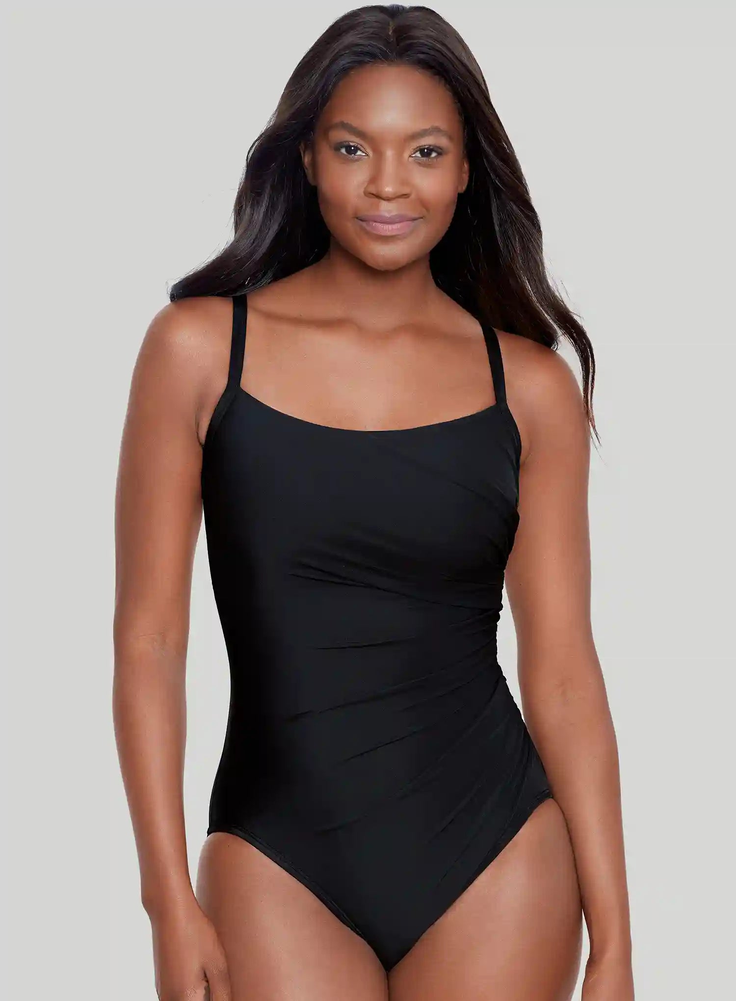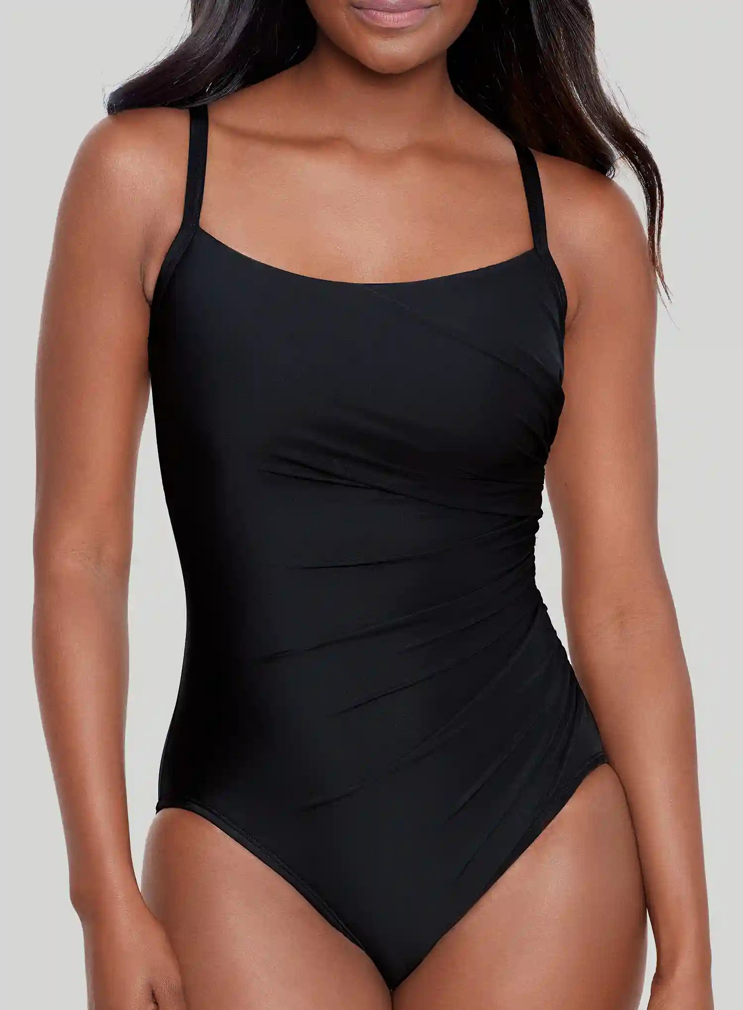 MIRACLESUIT Rock Solid Starr Underwired Shaping One Piece in Black combines timeless elegance with powerful shaping technology. The softly curved square neckline frames the bust beautifully, while hidden underwire provides subtle lift and secure support. Thin adjustable straps allow you to customise the fit for comfort, creating a refined silhouette that feels as good as it looks.