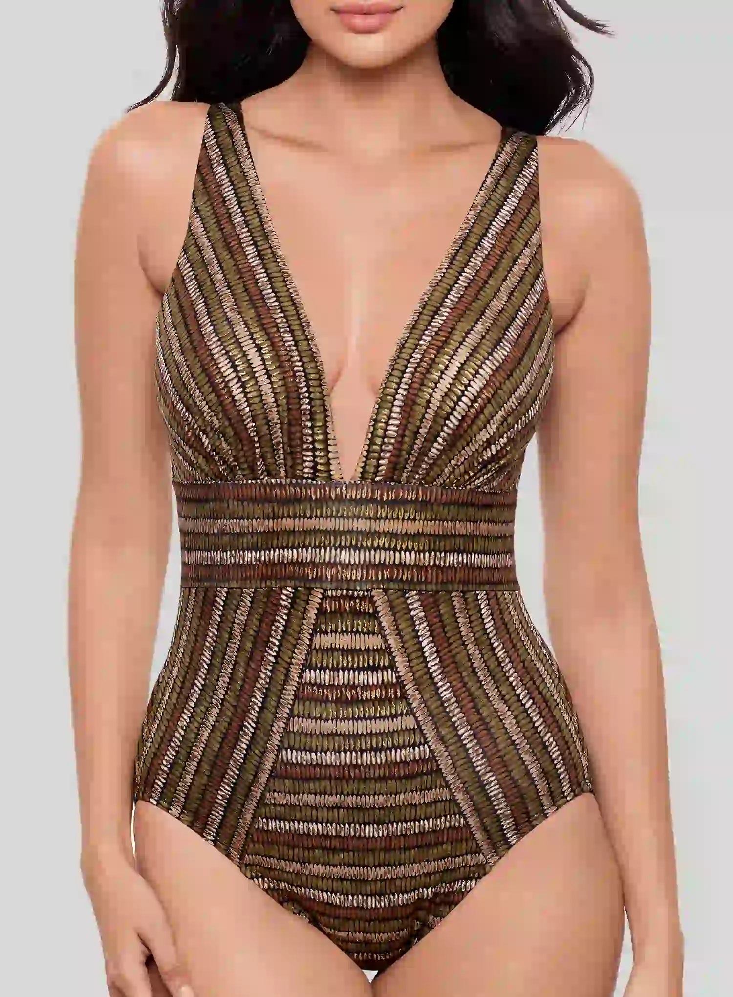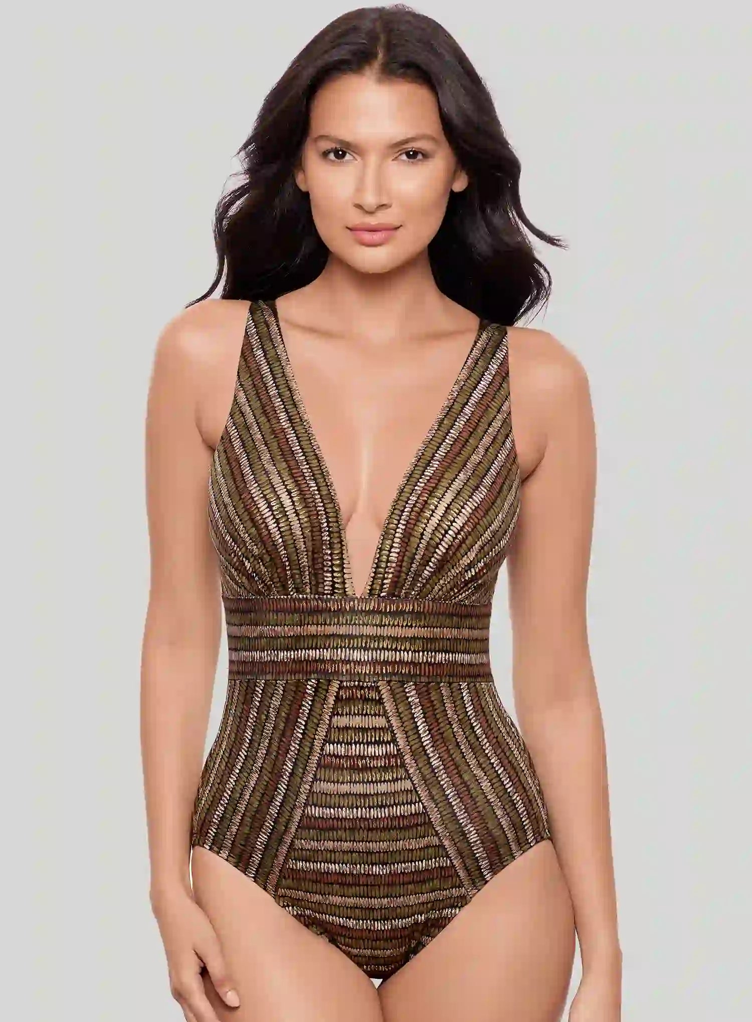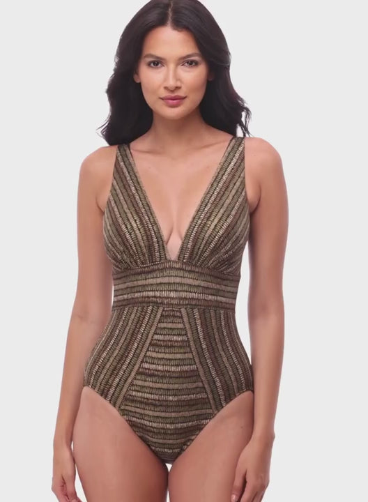 MIRACLESUIT Sparkle Sands Odyssey Soft Cup Shaping One Piece is designed to sculpt your shape while shimmering in the light. The deep V-neckline elongates your silhouette, while angled stripes cleverly contour the waist for an instant hourglass effect. Crafted from signature Miratex fabric, it smooths and slims so you feel confident from every angle.