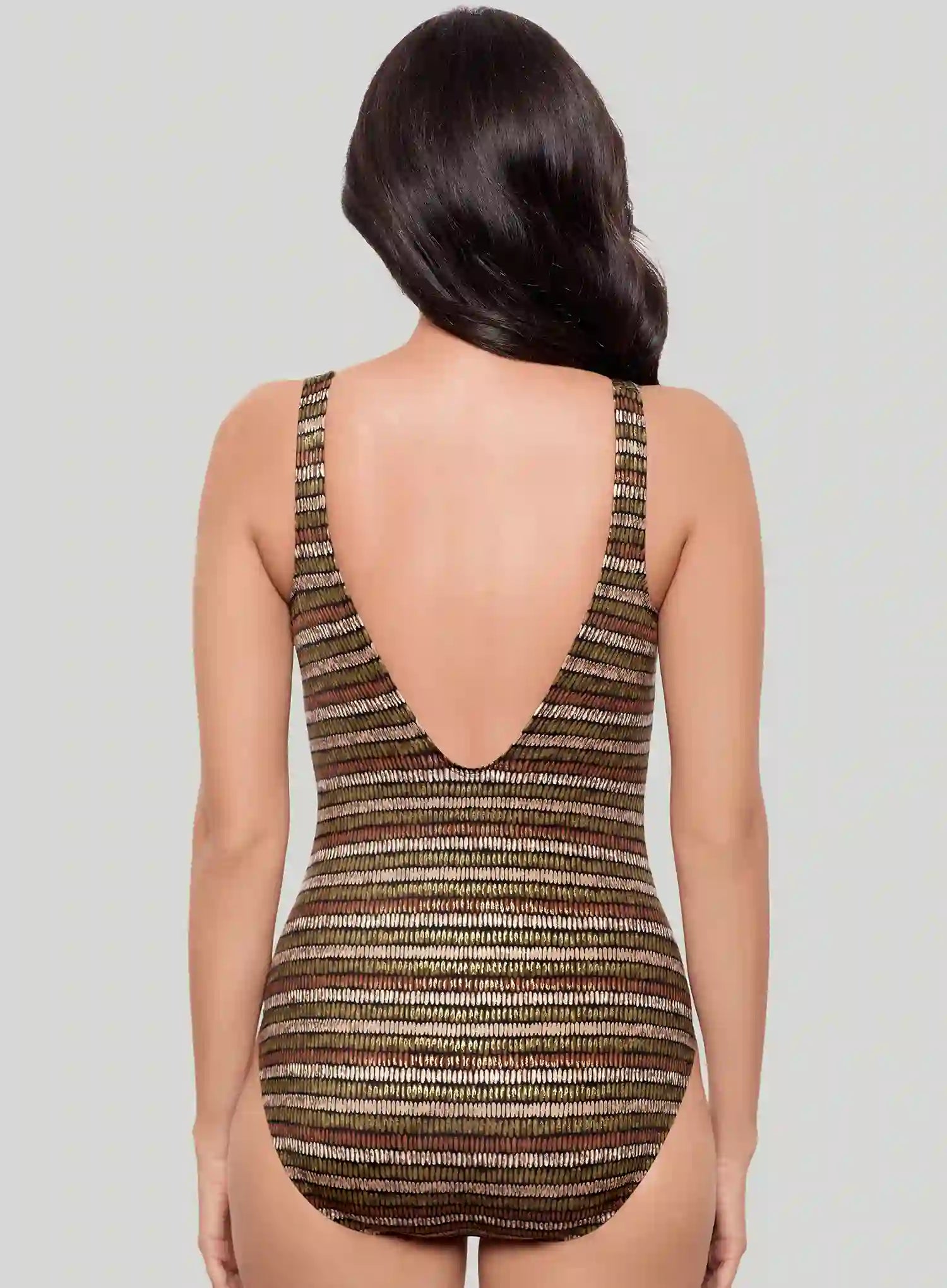 In the Sparkle Sands print, warm metallic stripes catch the sun for a look made for resort cocktails or a sunset swim. Wide fixed straps keep you secure and comfortable, while the scoop back adds a sleek finish. A chic, fashion-forward style for your next holiday escape.