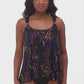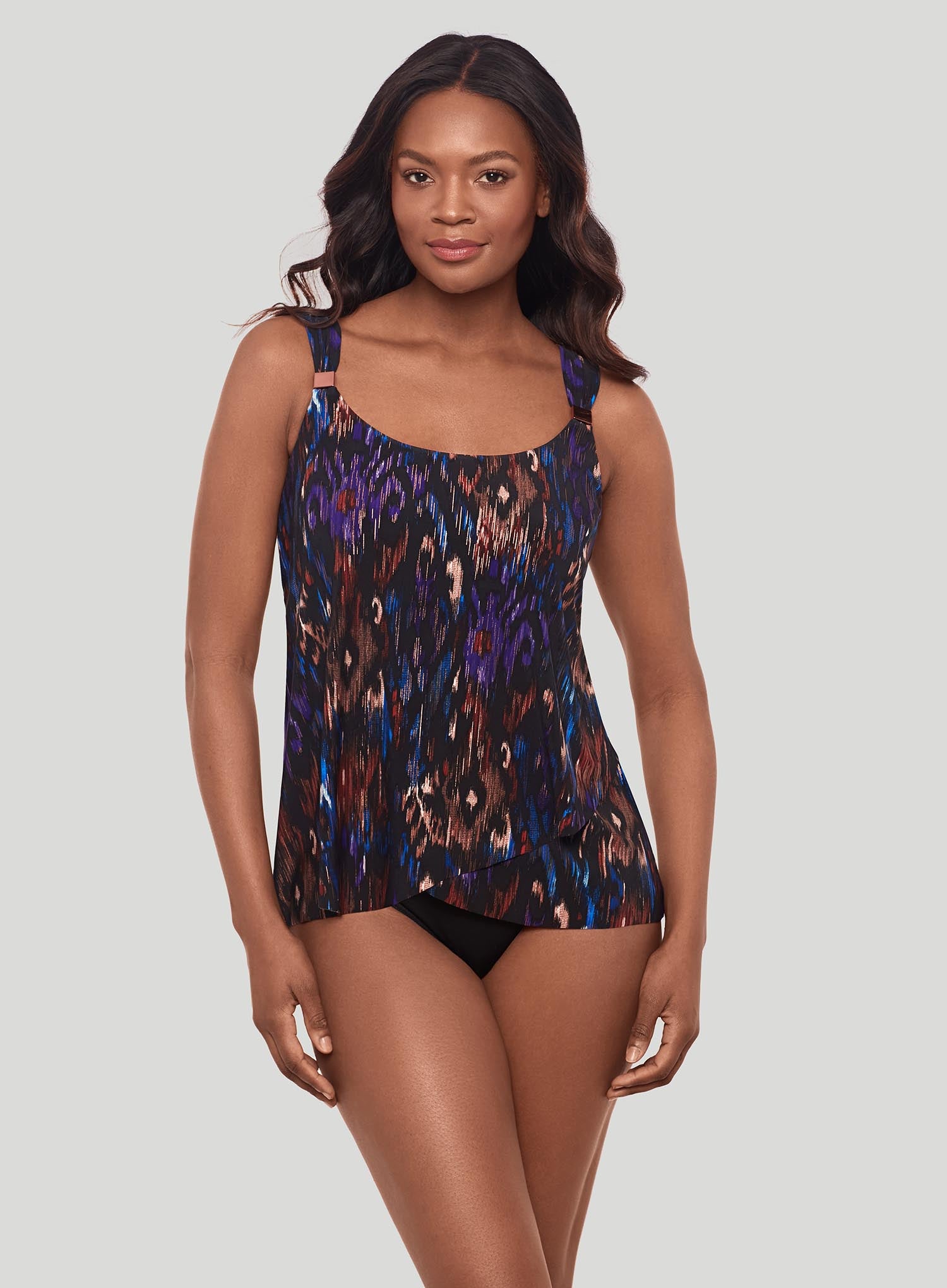MIRACLESUIT SWIMWEAR Tapiz Dazzle Underwired Tankini Top Black Multi will flatter your figure instantly! Made with patented Miratex fabric, this tankini helps you look up to 10 lbs lighter in just seconds. The expertly designed draping across the tummy area creates a slimming effect, while the scoop neckline and adjustable straps offer a perfect fit and customizable lift. Stylish hardware details on the straps add a chic accent. The vibrant print blends rich hues of purple, blue, and earthy browns, creating a striking, abstract pattern that adds a touch of sophistication to your swimwear collection.