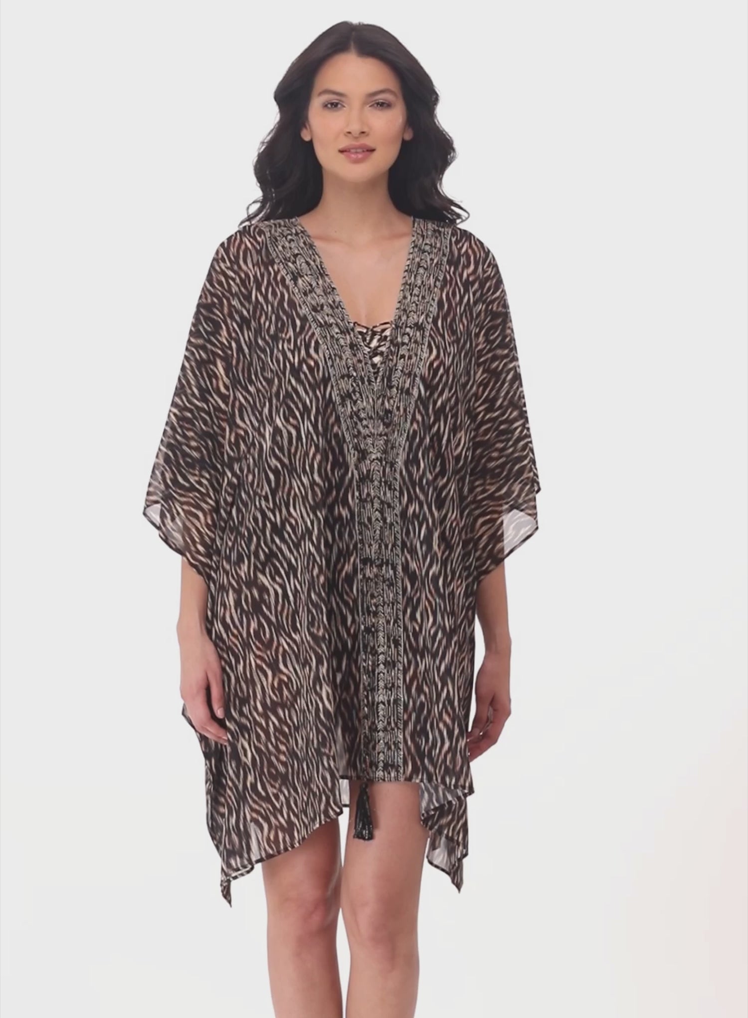 MIRACLESUIT SWIMWEAR Topkapi Kaftan in Black Multi the perfect swimwear cover-up that combines effortless style with vibrant elegance. This easy, breezy, one-size kaftan features a luxurious chiffon fabric adorned with a bold, abstract animal motif. Designed with a flattering V-neckline and playful lace-up tassels, this kaftan is both chic and comfortable, making it the ideal companion for your next sunny getaway. Pair this lavish design with your fave Miraclesuit Swim for the ultimate poolside look.