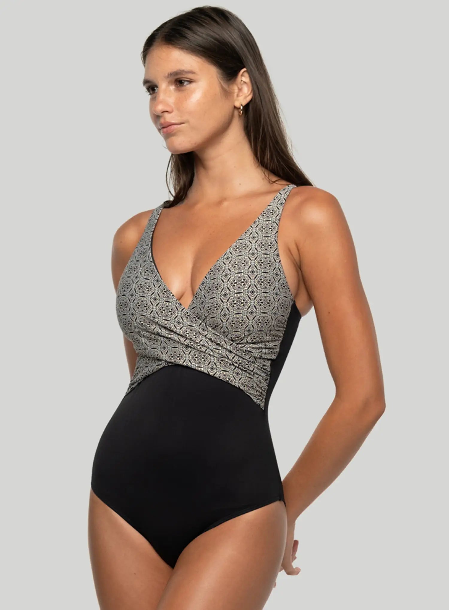 NIP TUCK Tintilating Tile Ava Wrap Over Multifit One Piece in Black brings understated glamour to the water. A subtle foil print in gold catches the light across the bodice, contrasted with sleek black at the base for a flattering silhouette. The wrap-over neckline and ruched front sculpt and contour, while the powermesh lining works quietly in the background for body confidence you can feel.