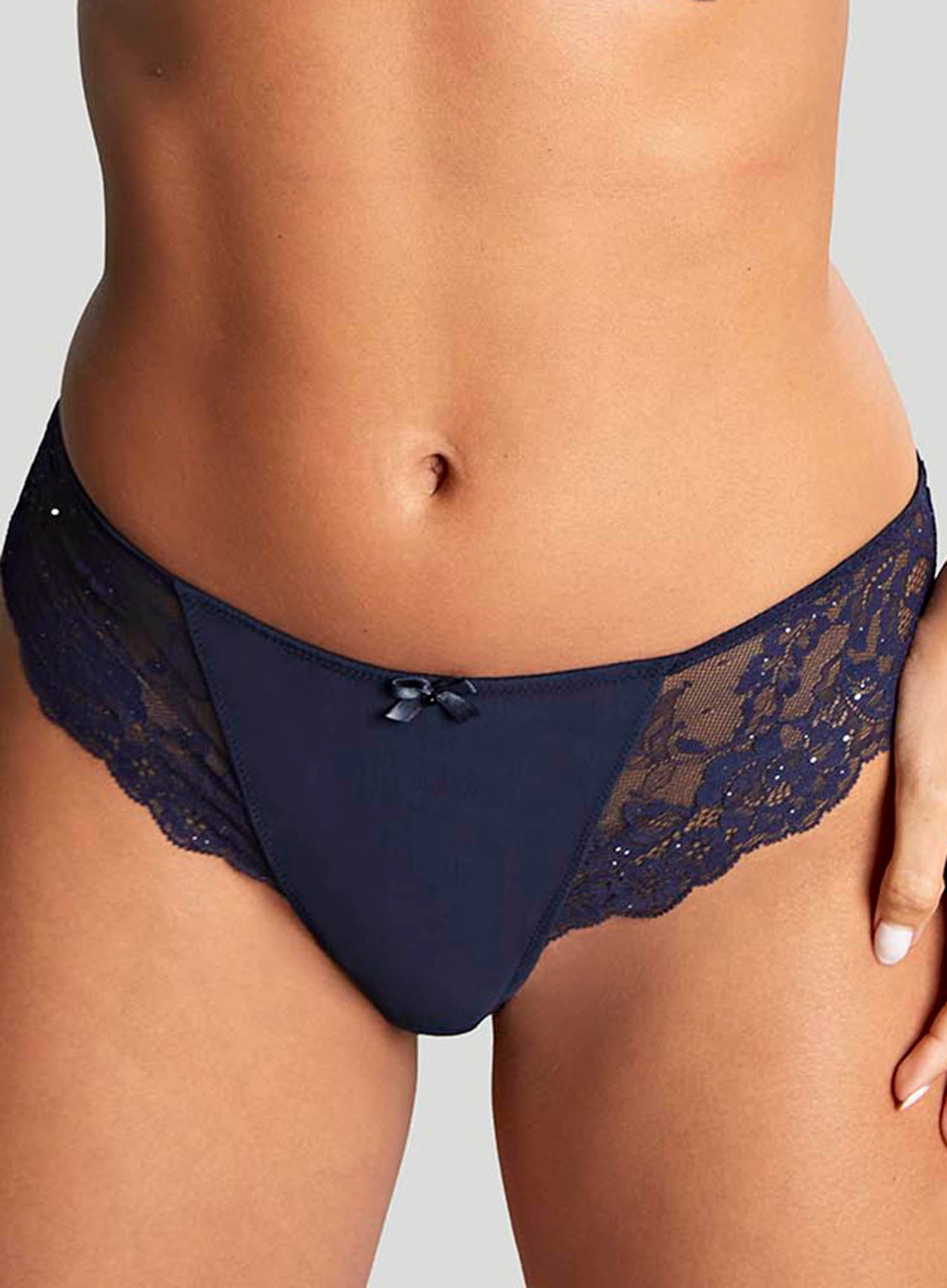 PANACHE Ana Brazilian Midnight Sequin is our most loved style, reimagined! This season, Ana is dressed in a new-to-market sequin yarn, intricately knitted into the lace. Ana features a stretch lace front with a modesty panel and a smooth lace back with a non-visible panty line. Complete your Ana set today. This colour is available for a limited time only.
