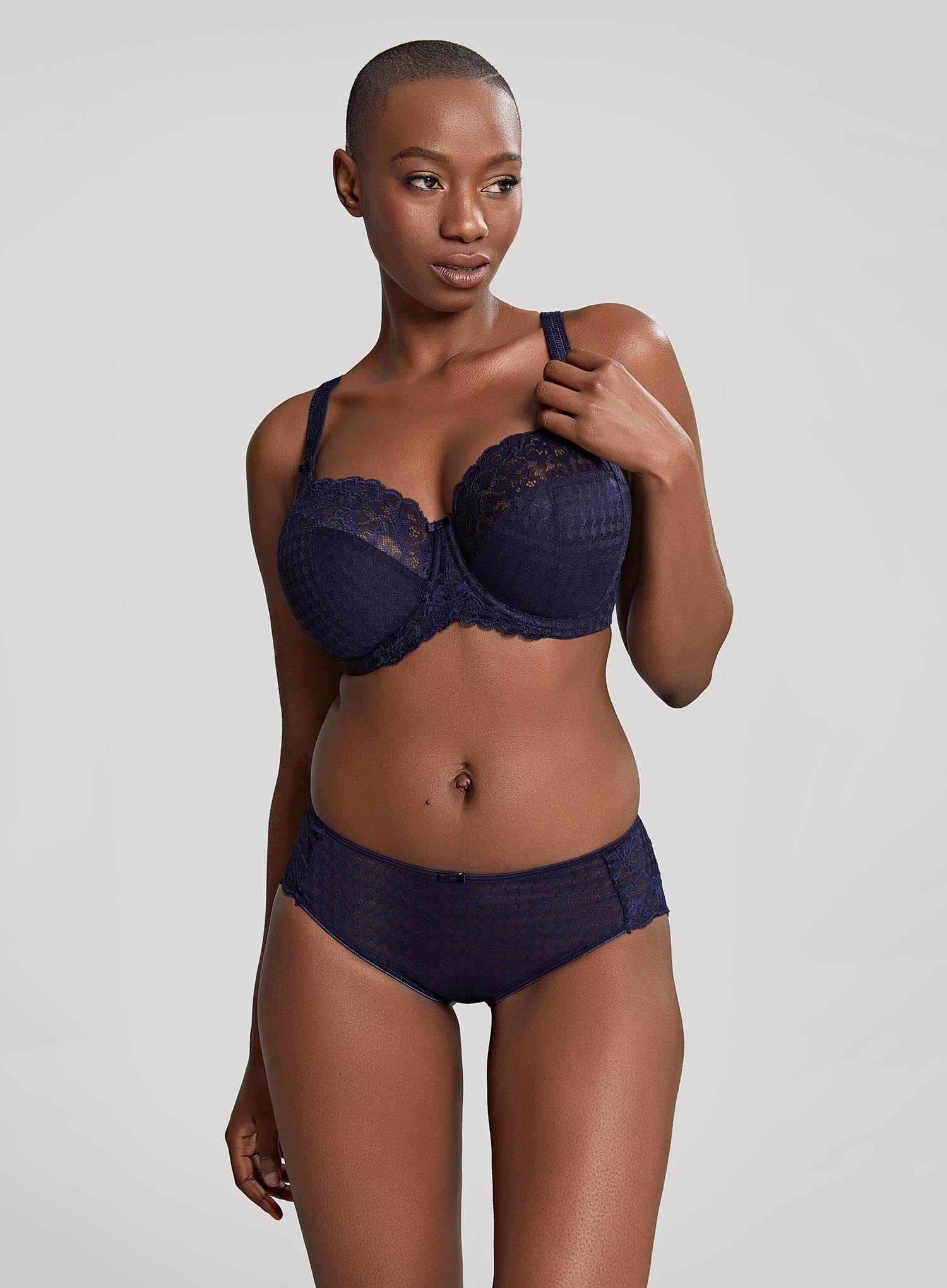 PANACHE Envy Full Cup Bra in Navy is an iconic style and one of DeBra’s best sellers for our D cup and up ladies. 4-piece stretch lace top cups and laminated bottom cups makes this one of the most supportive and forgiving styles our fitters have seen. This design will give you a beautiful rounded shape and forward projection. Designed with all-over jacquard lace and floral lace top cups, the Envy Full Cup will never go out of style.