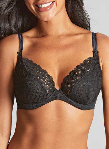 PANACHE Envy Plunge Bra Black is our best-selling Panache collection reimagined in a long-awaited new plunge silhouette! Envy has long been celebrated as a trusted favorite among our loyal customers, renowned for its perfect balance of rigid support and timeless appeal. While we honor this sense of familiarity and reliability, we also love to introduce fresh, modern touches to keep the range exciting. The latest Envy design showcases the same unique combination of houndstooth jacquard and floral lace, creating an effortlessly chic and feminine look. With its clever v-front construction, it offers the illusion of a deeper plunge while maintaining the exceptional support Envy is known for, making it a go-to choice for style and comfort.