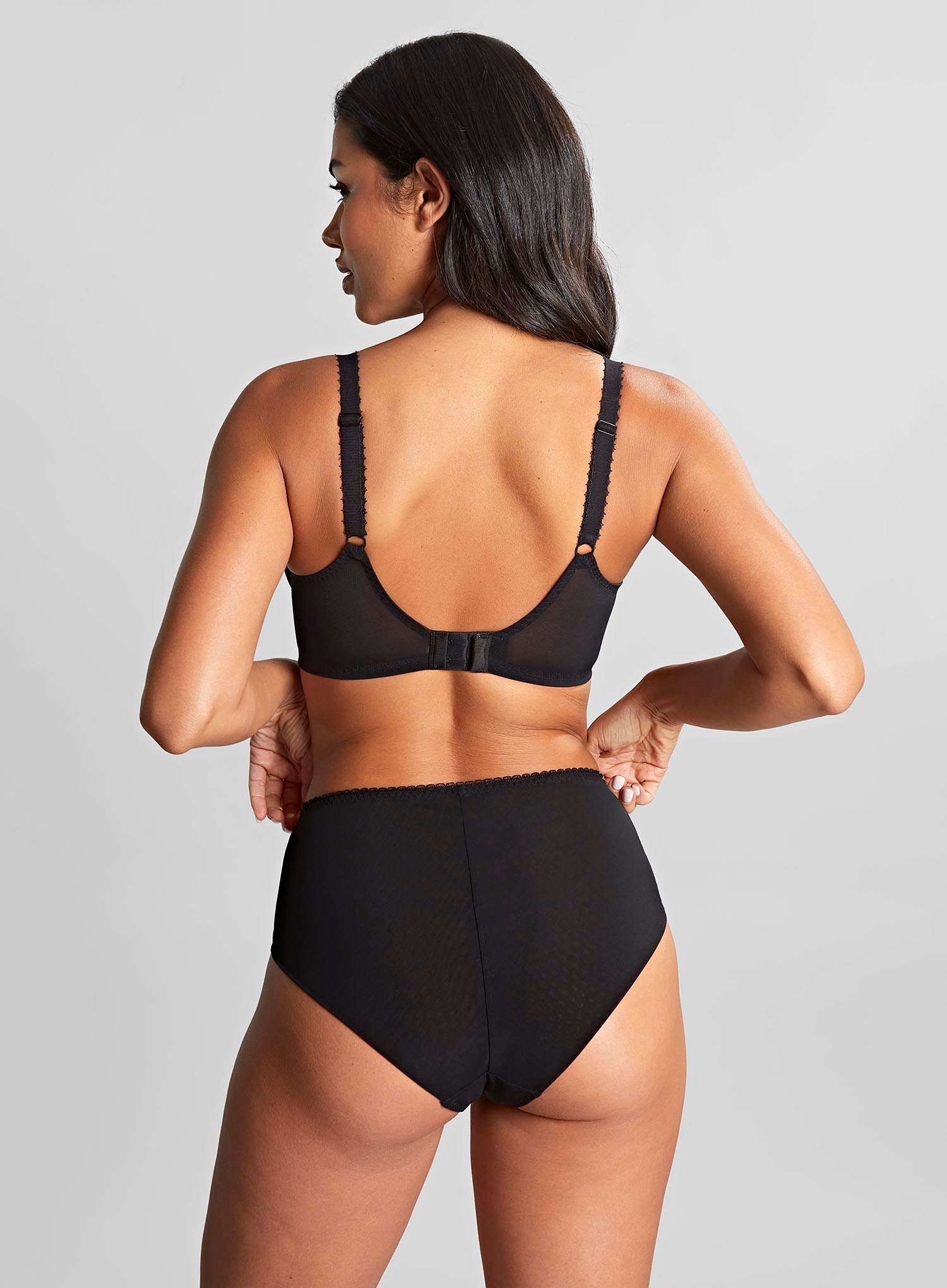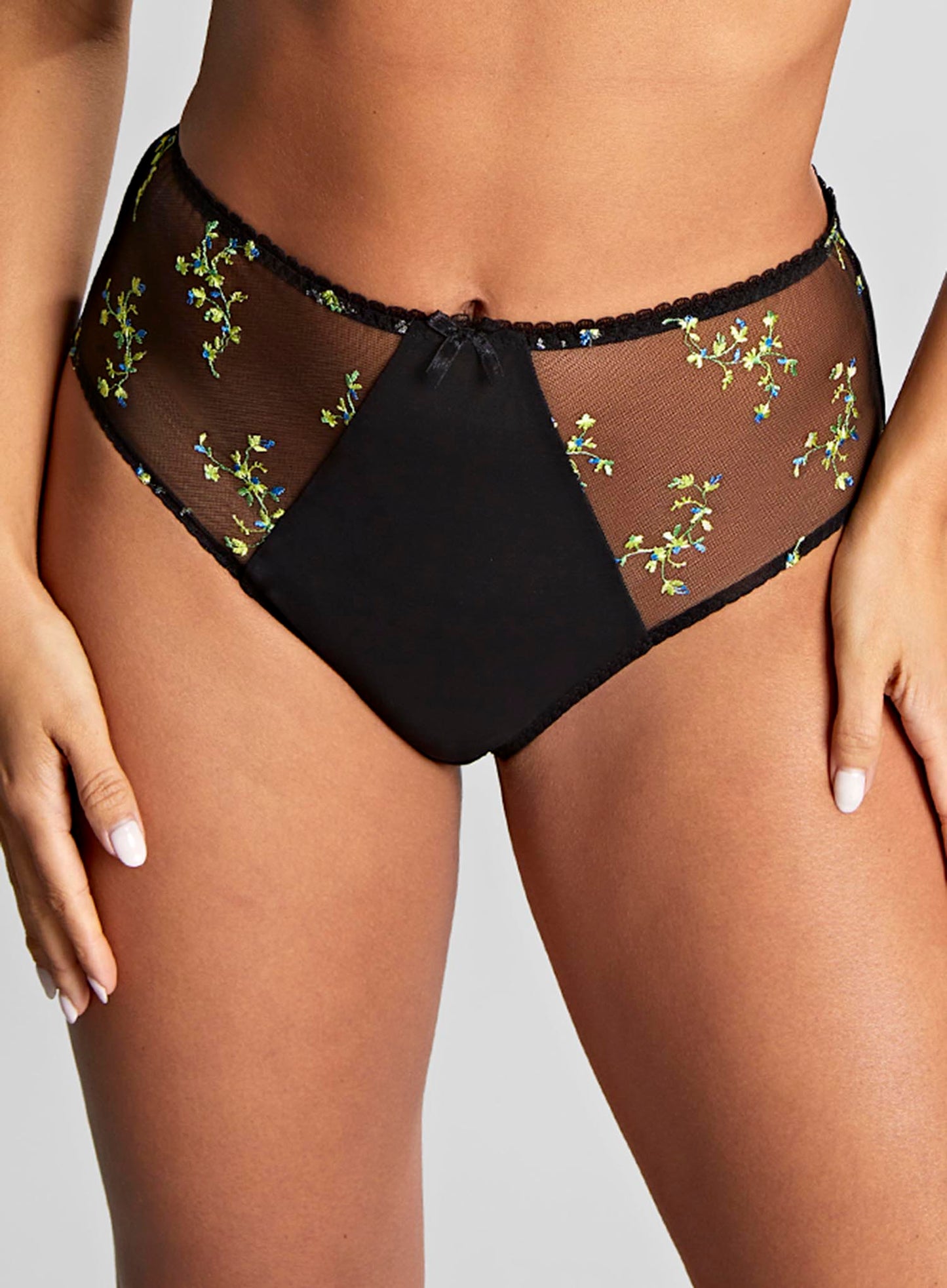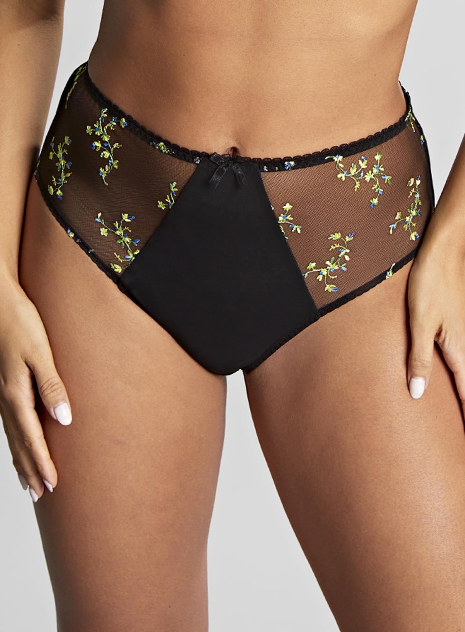 PANACHE Meadow Deep Brief in Black is a result of passion, style and expertise. Designed to make you feel amazing, this enchanting new collection will transport you straight to the springtime, featuring embroidery bursting with colour on a delicate black mesh base. Embroidered side panels and lined mesh front panels make for a soft comfortable fit.