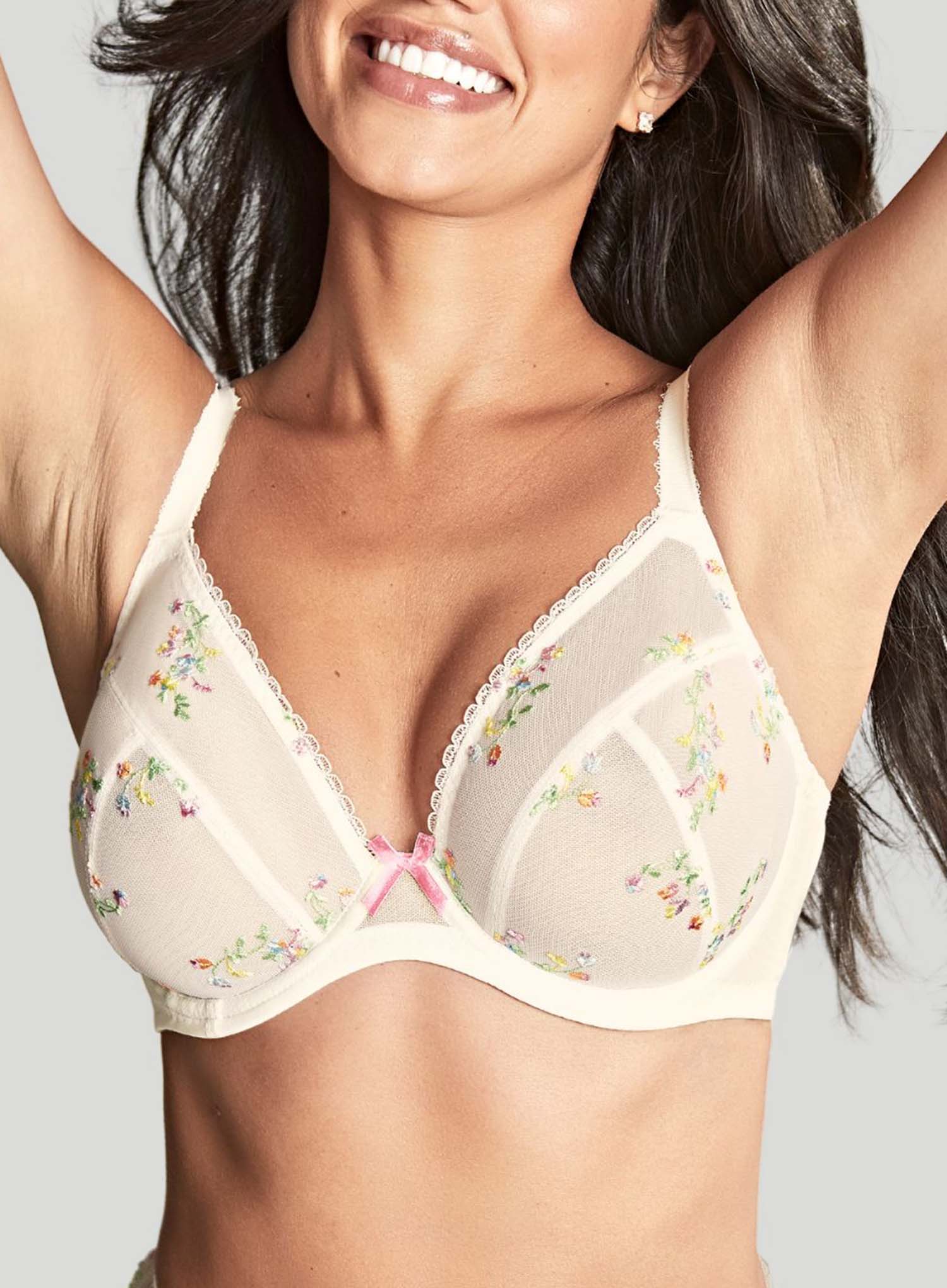PANACHE Meadow Plunge Bra in Ivory is proof that detail is everything. This enchanting new collection will transport you straight to the springtime, featuring embroidery bursting with colour on a delicate ivory base. Rigid bottom cups and lined top cups sit on the cradle, which offers unmatched forward projection and extreme comfort. Finished with pretty trim and strap detailing, this piece is a must have, paired with the Deep Brief or Brazilian Brief.
