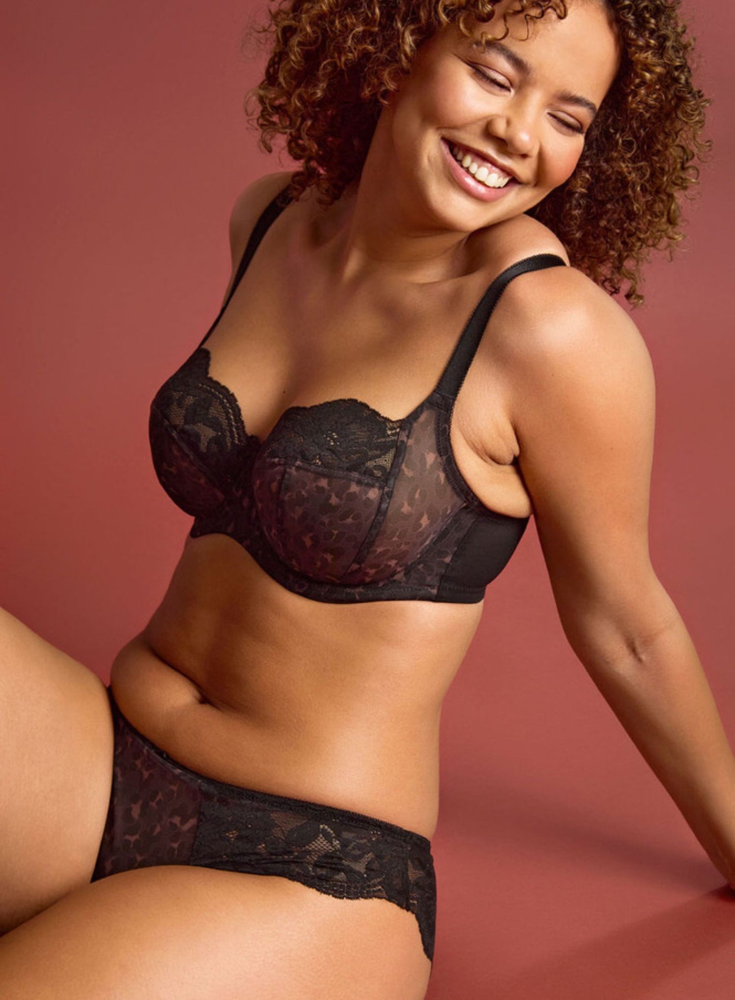 PANACHE Nina Balconette Bra in Black Leopard is a fresh take on our beloved Jasmine line. It has the stunning fit and lift of Jasmine, with some modern touches that take it to the next level. The classy, feminine lace is made with recycled yarns, and the flexible lace top cups offer a comfy fit. Instead of Jasmine's lined bottom cups, Nina has ones made from rigid printed fabric, for a daring, sheer style. Take a walk on the wild side with Nina this season.