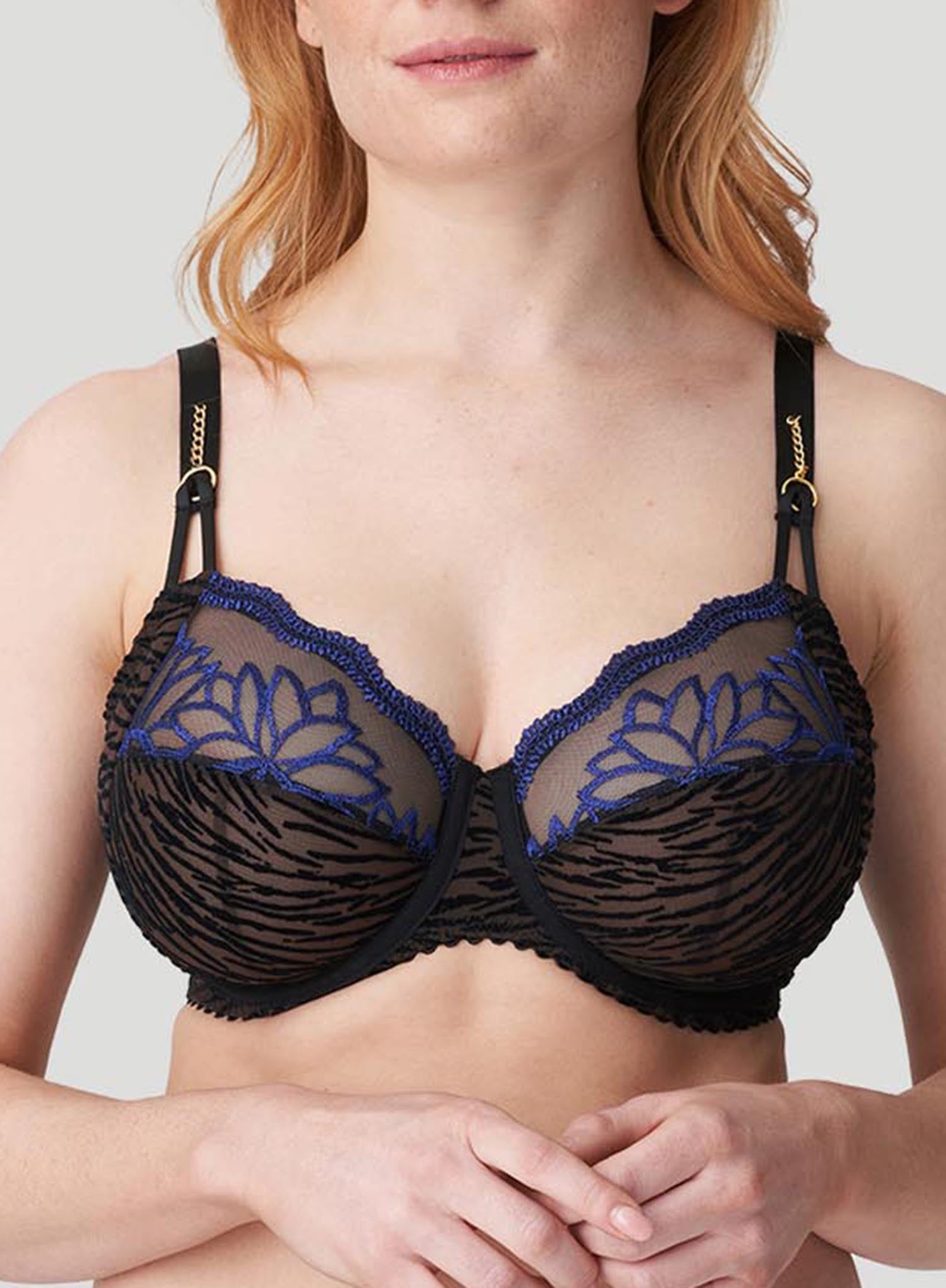 PRIMADONNA Cheyney Underwired Full Cup Bra is an incredibly stylish new design that is made to accentuate your cleavage and adorn you in luxurious lace and embroidery. The bright blue lotus flower embroidery in the top cup is paired with a sexy, opaque flock print on the bottom, for a fun, fresh combination. Delicate, gated straps are emphasised with gold chain detailing for a chic, sultry look.