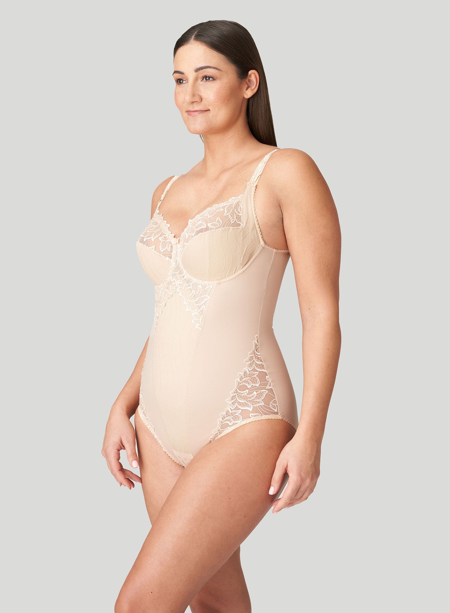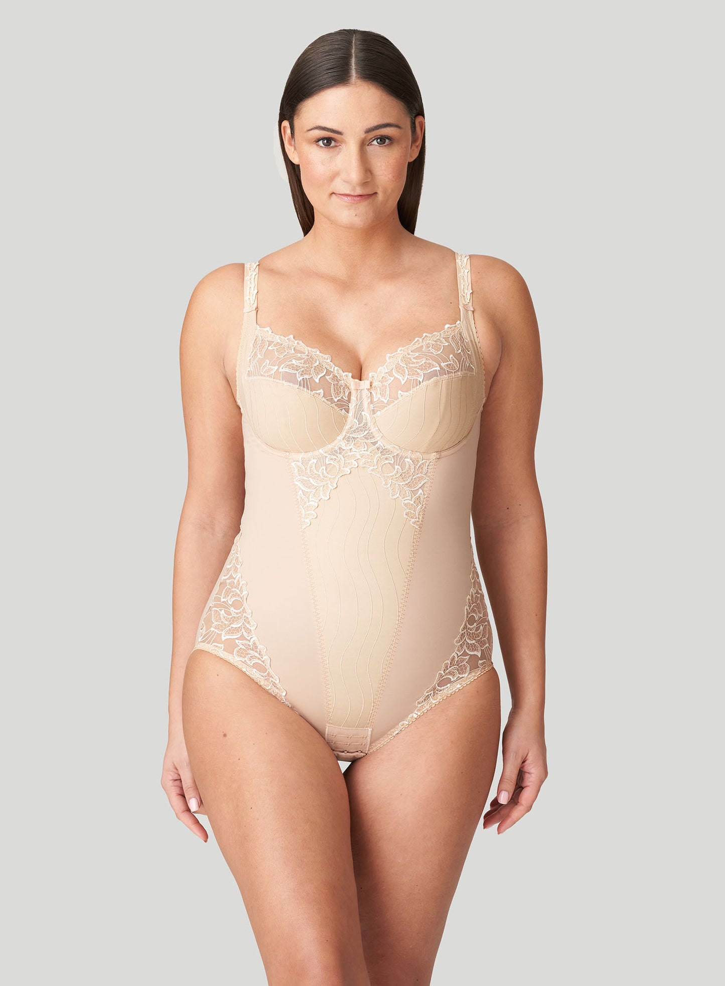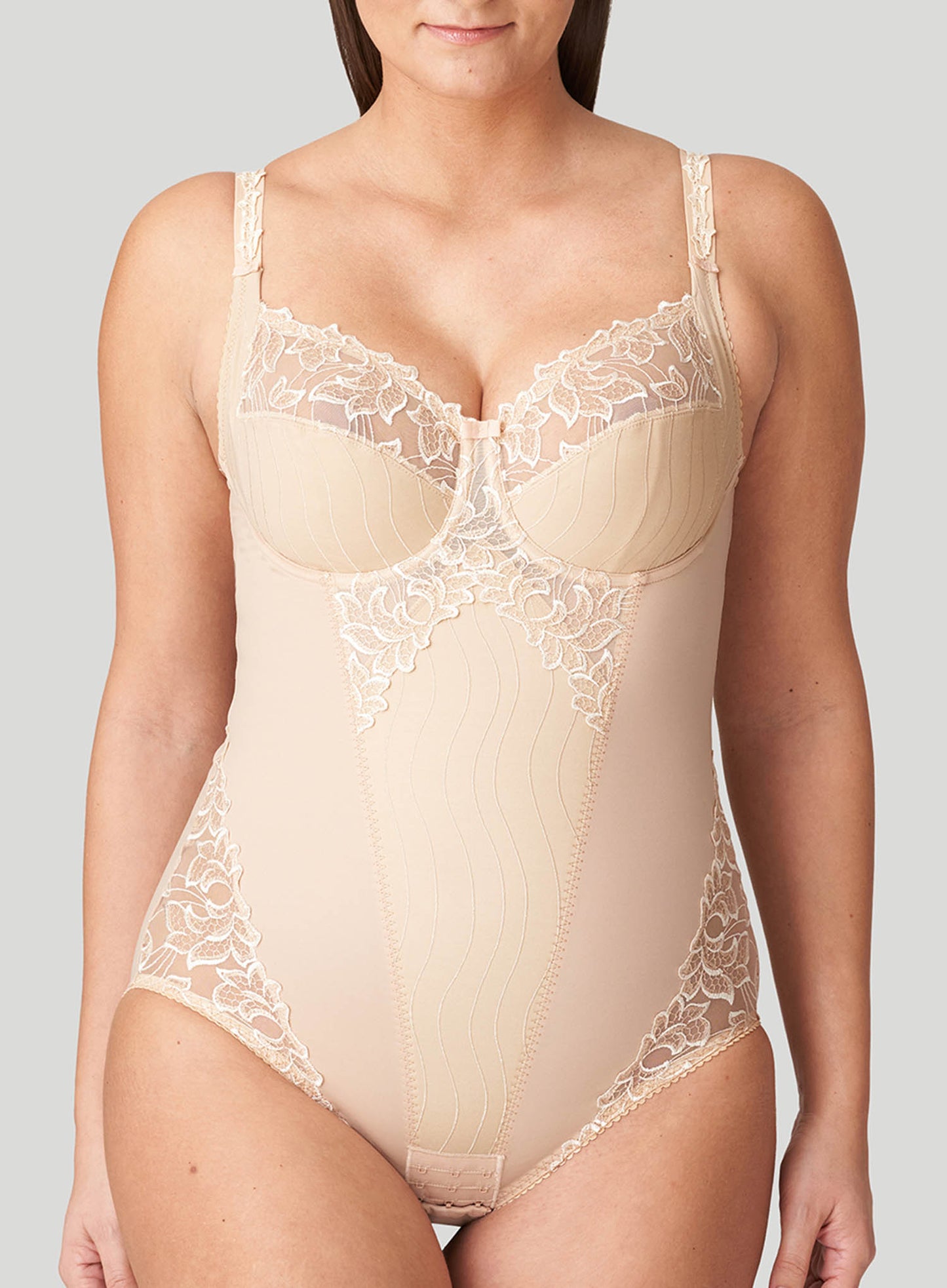 PRIMADONNA Deauville Bodysuit in Cafe Latte has the same bra that you have come to know and love built into a luxurious shaping bodysuit. Featuring embroidery along the top of the cups, straps, leg line and on the front section of the body suit, this is a luxurious design. Its three-piece underwire bra ensures great lift and support while the mid-section of the bodysuit controls shape and smooths lines along the tummy area. This timeless bodysuit is great underneath clothing and is an essential addition to your lingerie wardrobe.