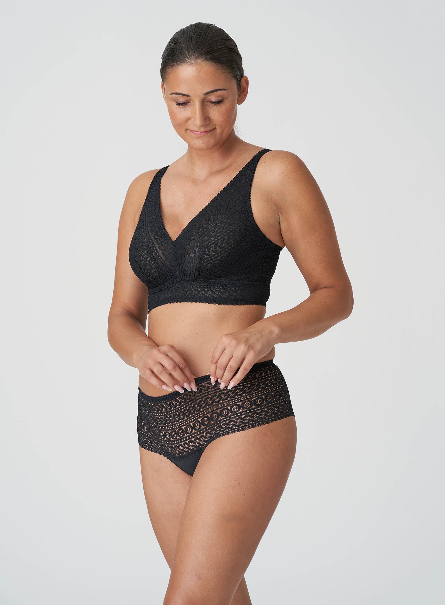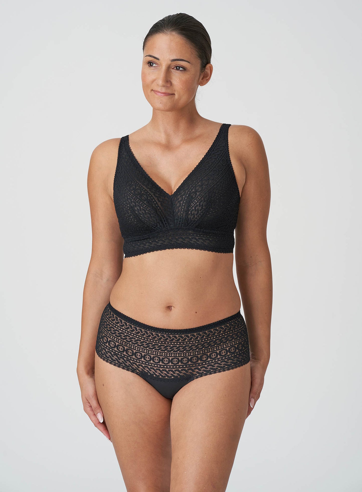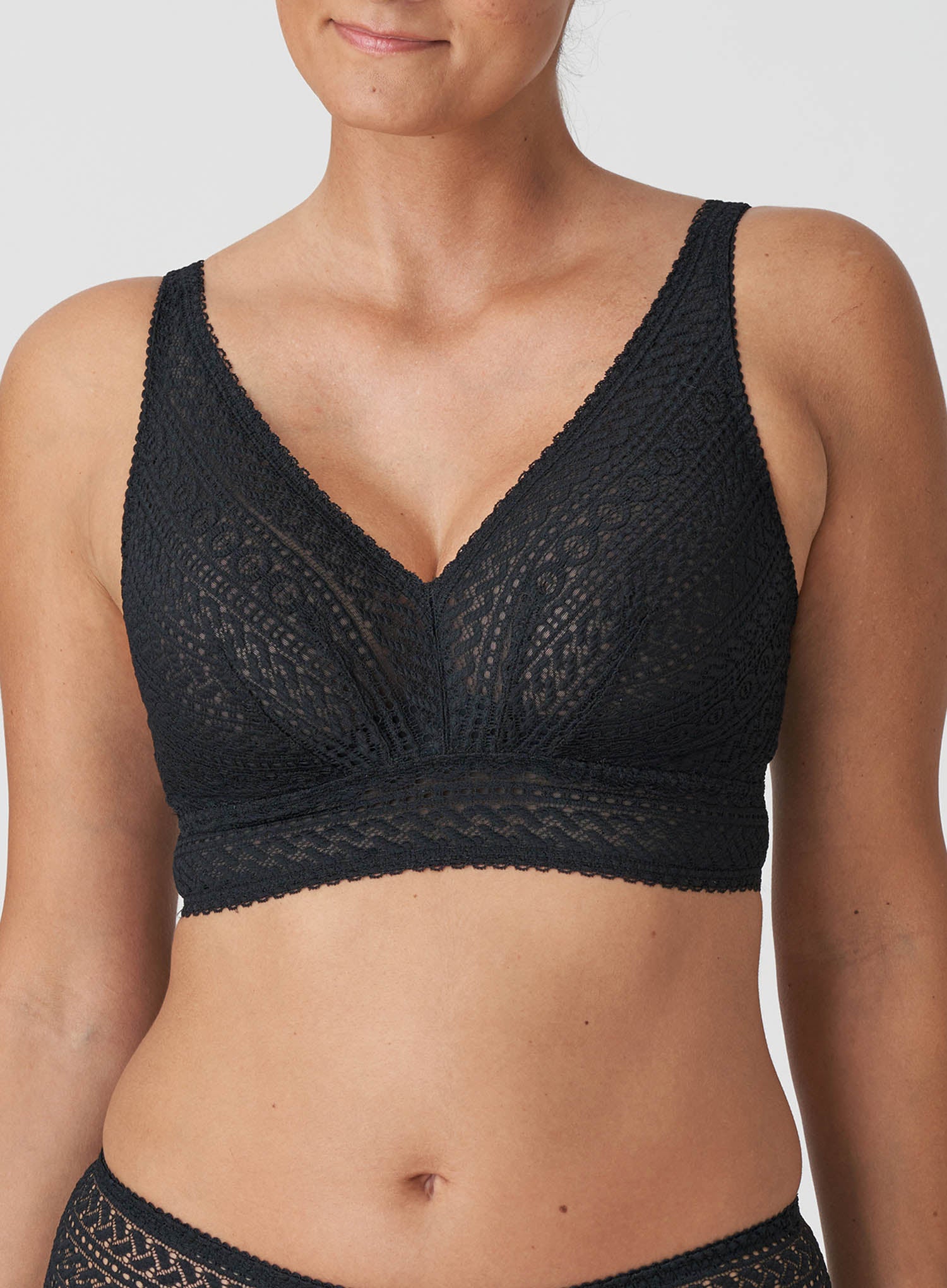 PRIMADONNA Montara Wirefree Full Cup Bra in Black is the design where comfort meets style – a match made in heaven. A trendy, wireless, triangle bralette design in all over lace with a modern, graphic pattern design, perfect for all day comfort and both under and outer wear with it’s longline cut and flattering V-neckline! Don’t wait, you need this in your wardrobe.