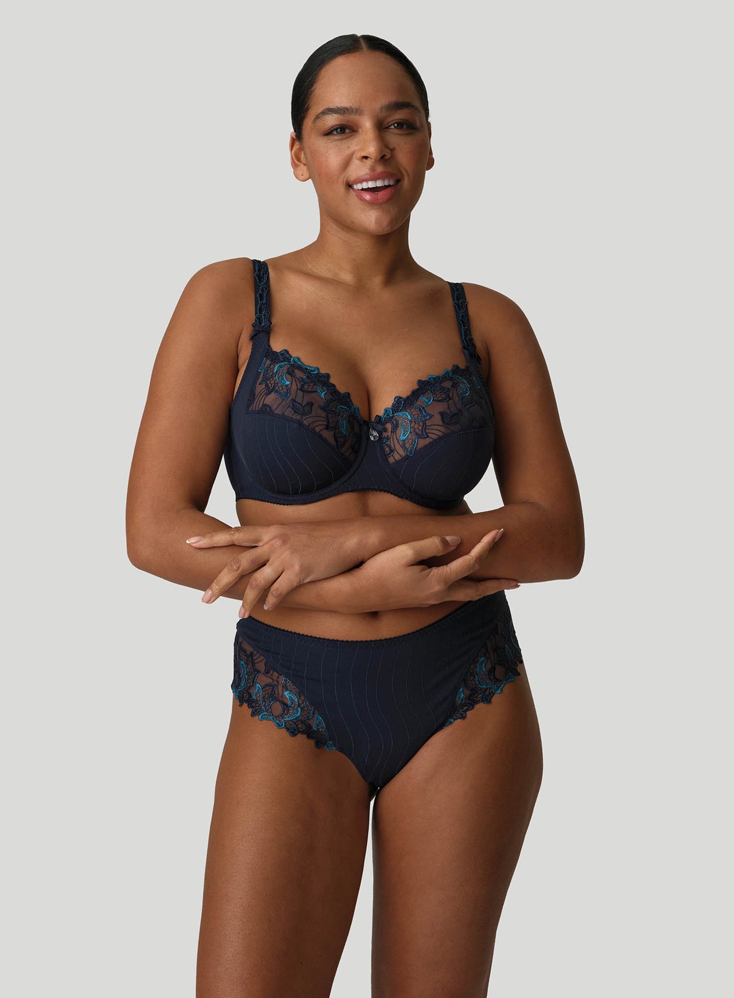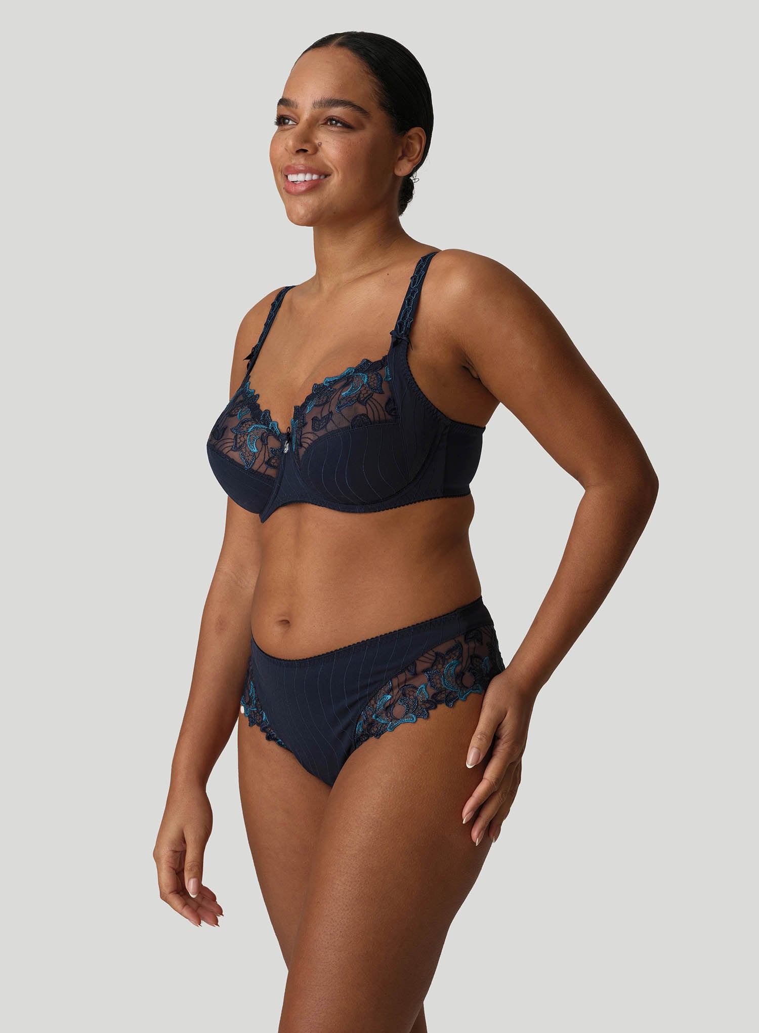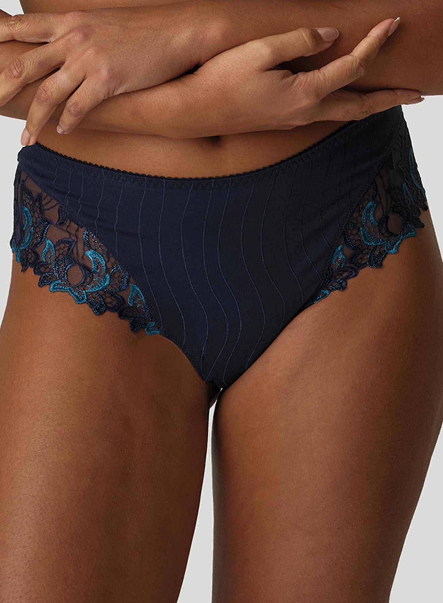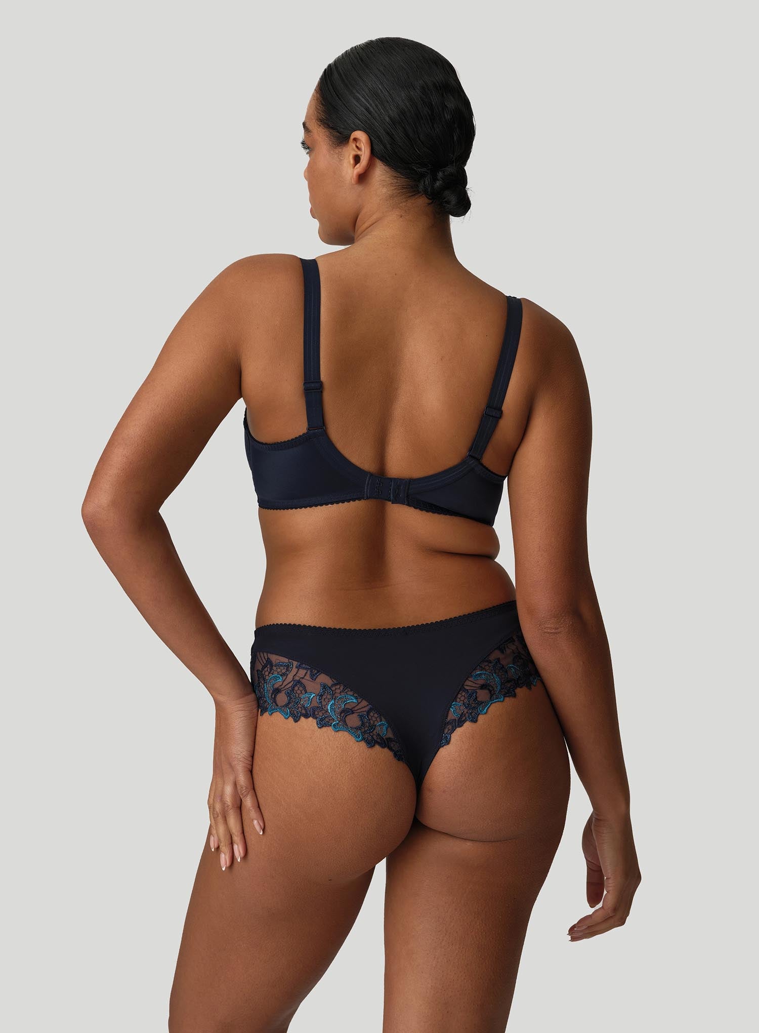 PRIMADONNA Deauville Luxury Thong Velvet Blue, the legendary PrimaDonna icon returns this season in an elegant midnight blue that is designed to flatter all skin tones. The high-cut leg and the embroidery of this design create a sexy and sophisticated look. This season comes with a modern twist on the classic Deauville embroidery, a beautiful ombre effect in shades of blue.