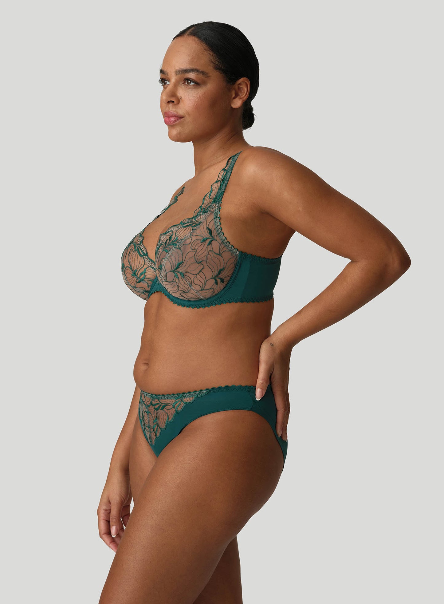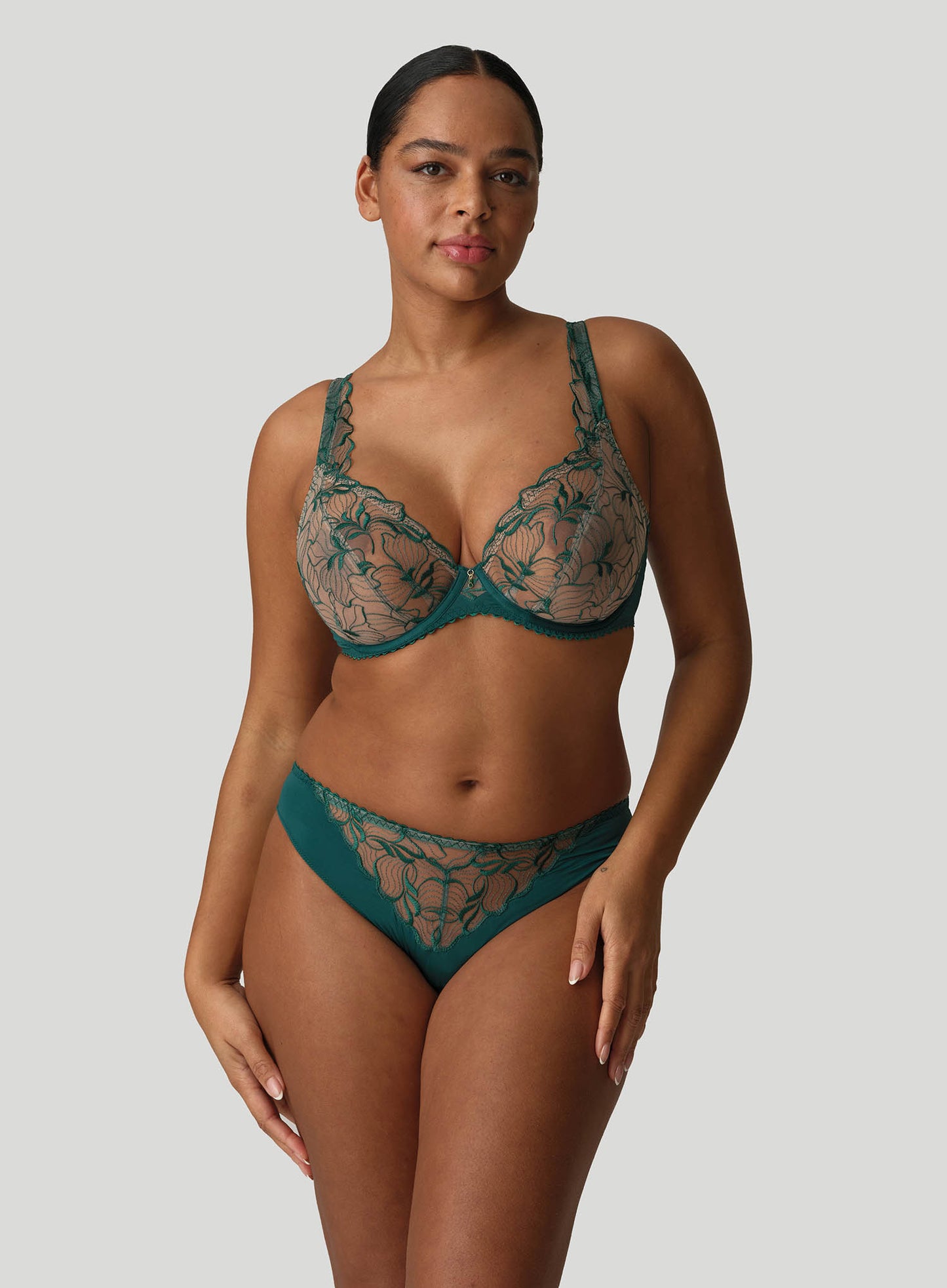 PRIMADONNA Springdale Rio Brief Jasper Green is our most elegant new arrival, showcasing emerald green embroidery set against a contrasting backdrop to achieve a stunning tattoo-like allure. These Rio briefs provide complete coverage, featuring a sophisticated leg cut in the front. Springdale presents a chic and airy appearance, combining fashionable flair with an impeccable fit.