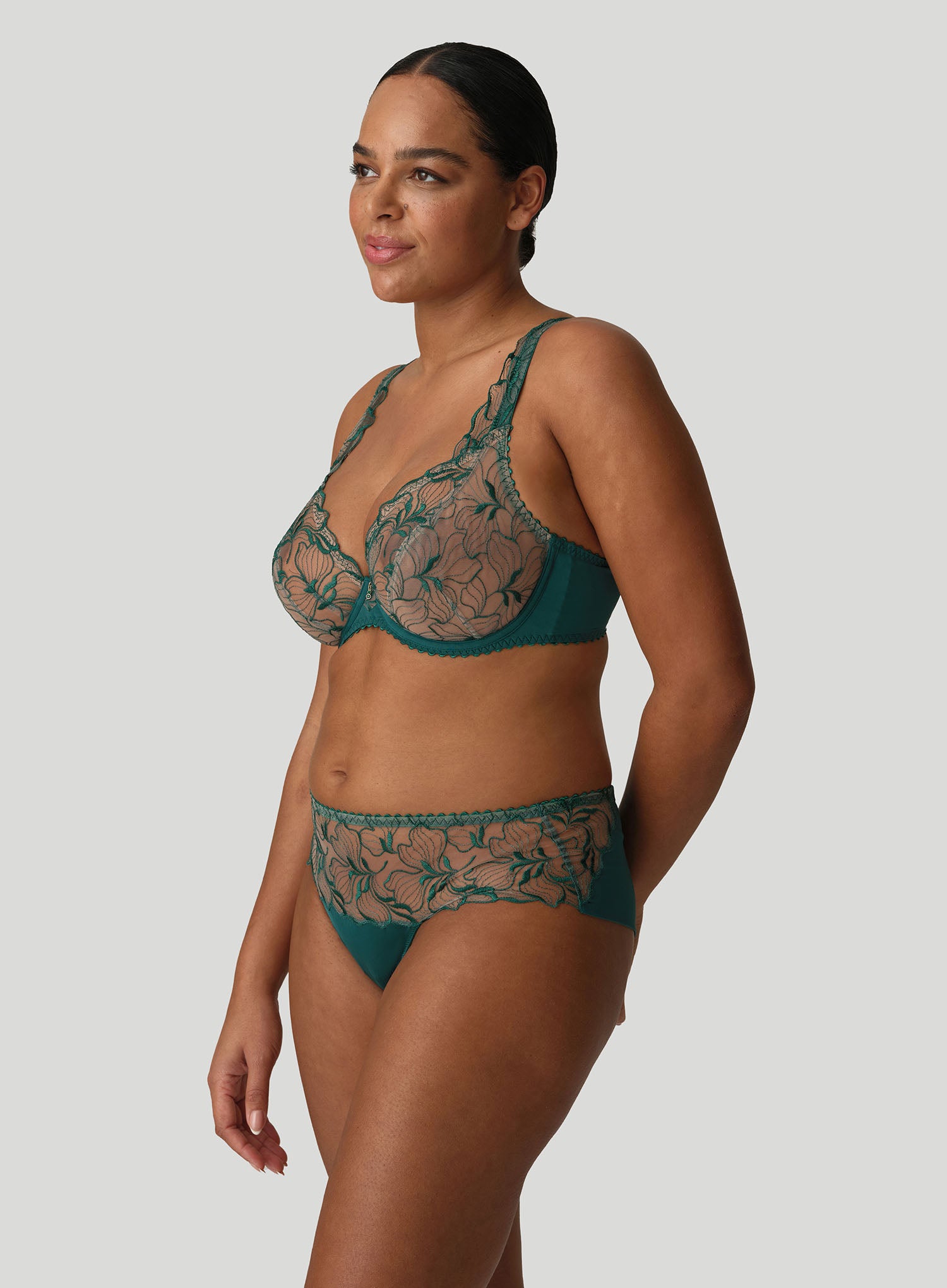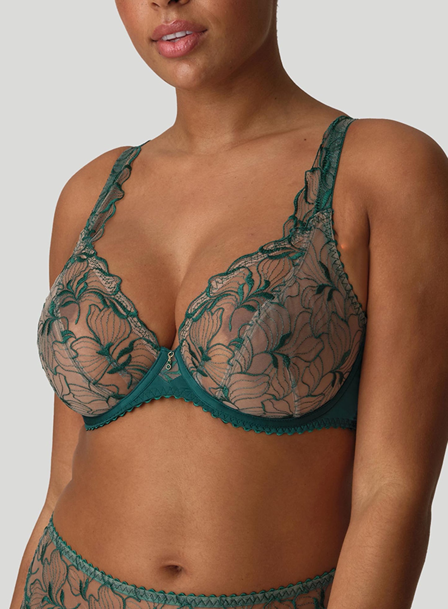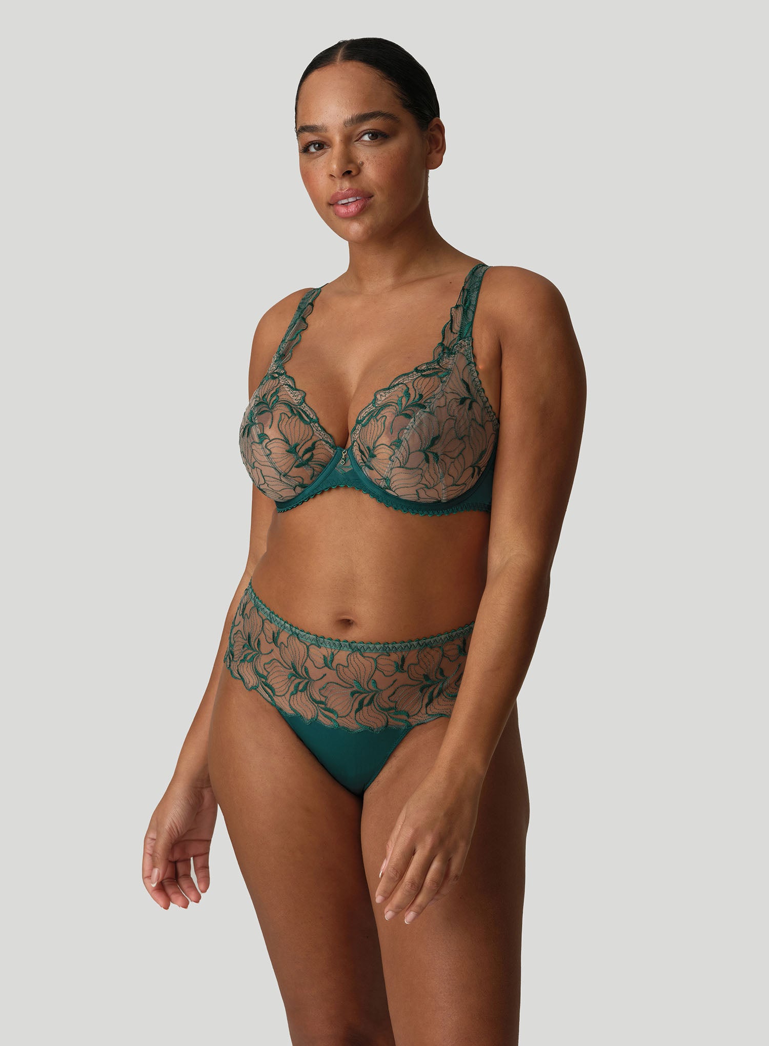 PRIMADONNA Springdale Underwired Plunge Bra Jasper Green is our most elegant new arrival, showcasing emerald green embroidery set against a contrasting backdrop to achieve a stunning tattoo-like allure. The plunge bra delivers exceptional support for larger cup sizes, courtesy of its robust tulle lining replacing padded cups. This ensures an ideal balance of support and style, maintaining its sensual appeal. Springdale presents a chic and airy appearance, combining fashionable flair with an impeccable fit.